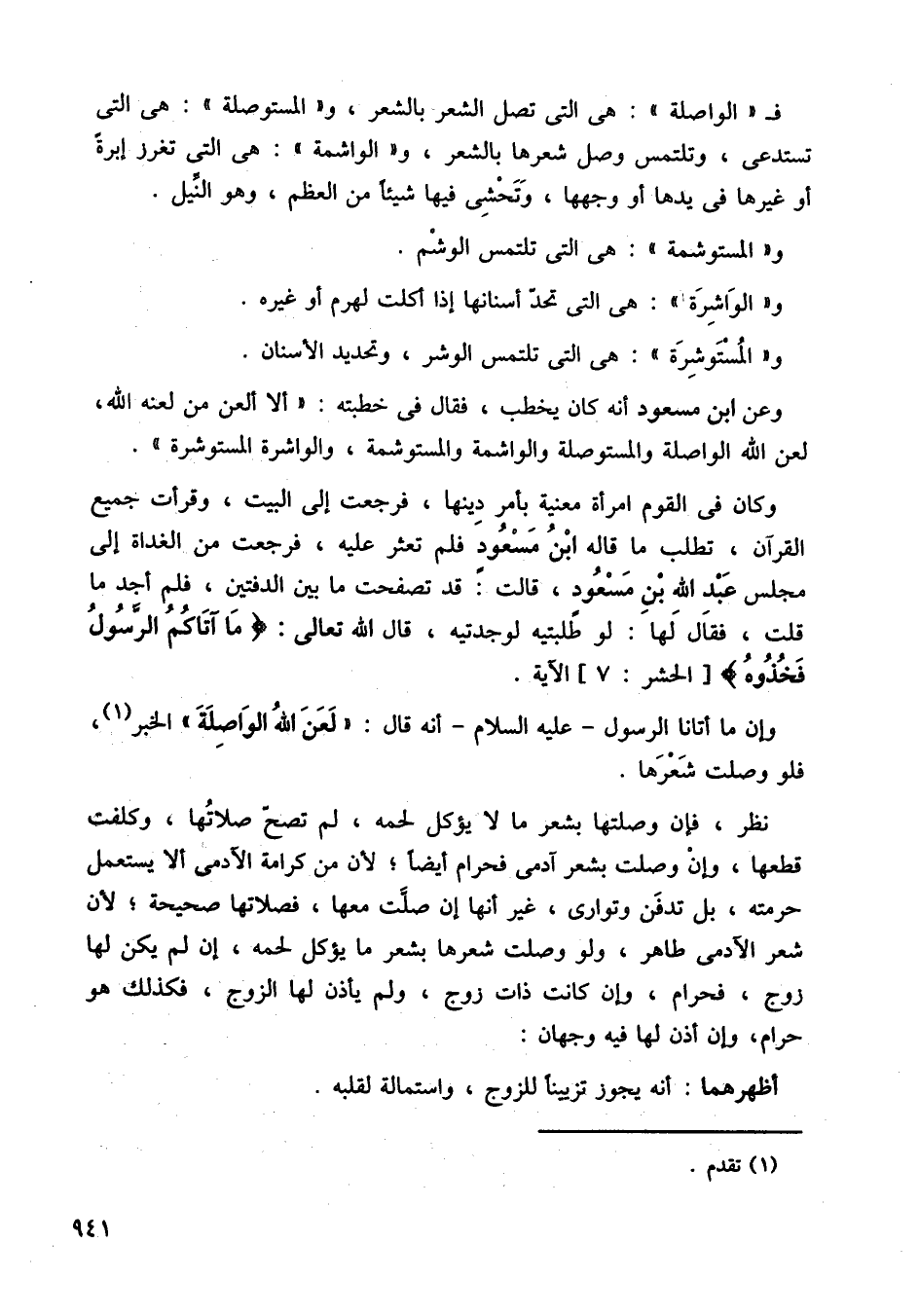 فـ (الواصلة): هي التي تصل الشعر بالشعر، و (المستوصلة)، هي التي تستدعي، وتلتمس وصل شعرها بالشعر، والواشمة، هي التي تغرز إبرة أو غيرها في يدها أو وجهها، وتحشى فيها شيئا من العظم، وهو النيل.