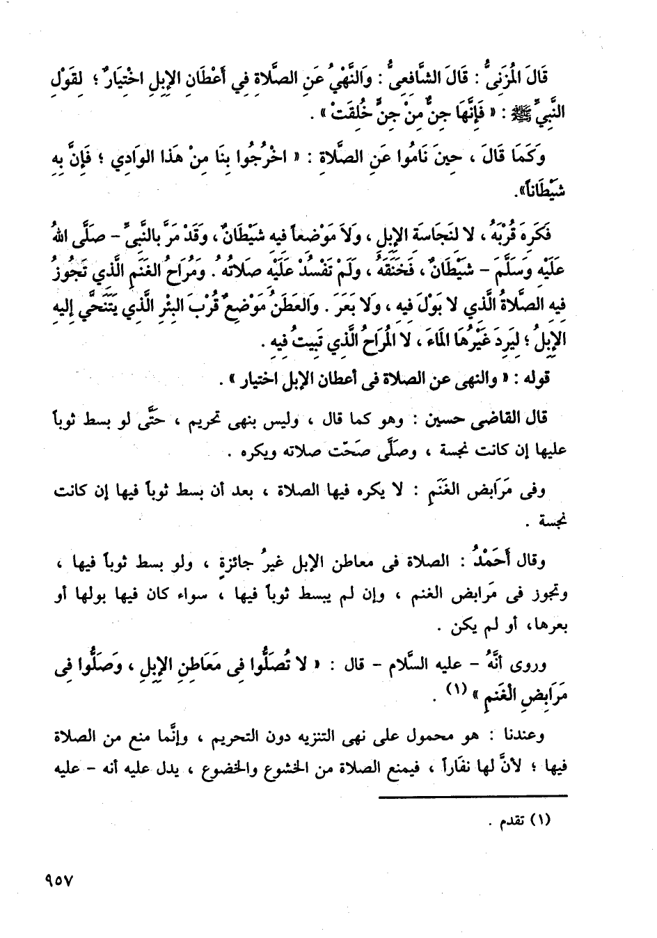 فكره قربه، لا لنجاسة الإبل، ولا موضعًا فيه شيطان، وقد مر بالنبي صلى الله عليه وسلم شيطان فخنقه، ولم تفسد عليه صلاته، ومراح الغنم الذي تجوز فيه الصلاة الذي لا بول فيه، ولا بعر، والعطن موضع قرب البئر الذي يتنحى إليه الإبل؛ ليرد غيرها الماء، لا المراح الذي تبيت فيه.