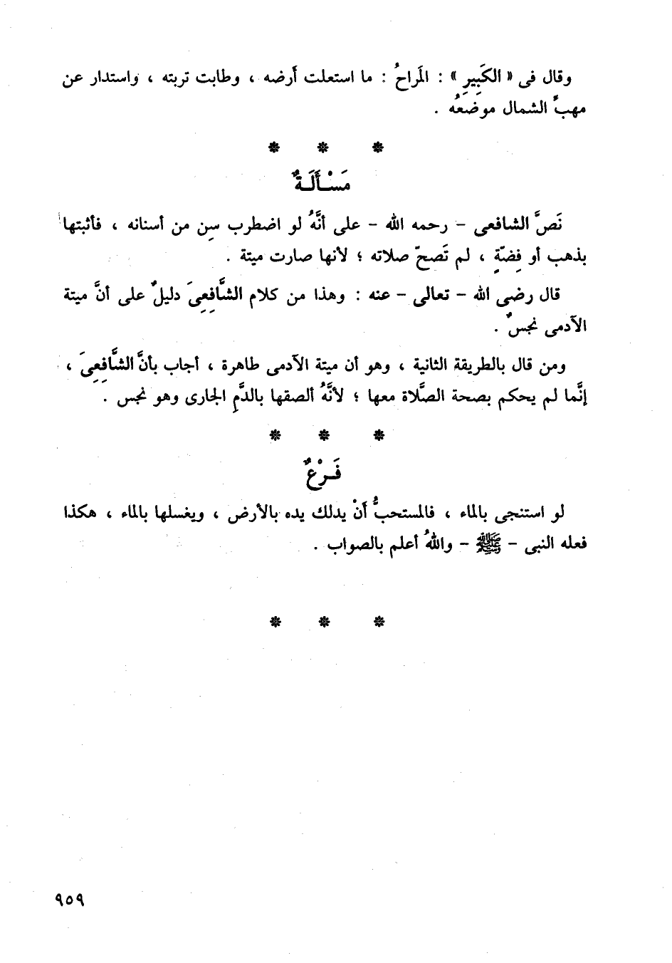 قال رضي الله تعالى عنه، وهذا من كلام الشافعي دليل على أن ميتة الآدمي نجس. ومن قال بالطريقة الثانية، وهو أن ميتة الآدمي طاهرة، أجاب بأن الشافعي، إنما لم يحكم بصحة الصلاة معها، لأنها ألصقها بالدم بالجاري وهو نجس.