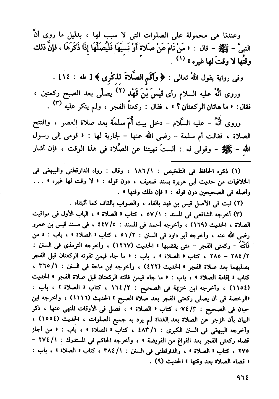 وروى أنه عليه السلام رأى قيس بن قهد يصلي بعد الصبح ركعتين، فقال: ما هاتان الركعتان، فقال: ركعتا الفجر، ولم ينكر عليه.