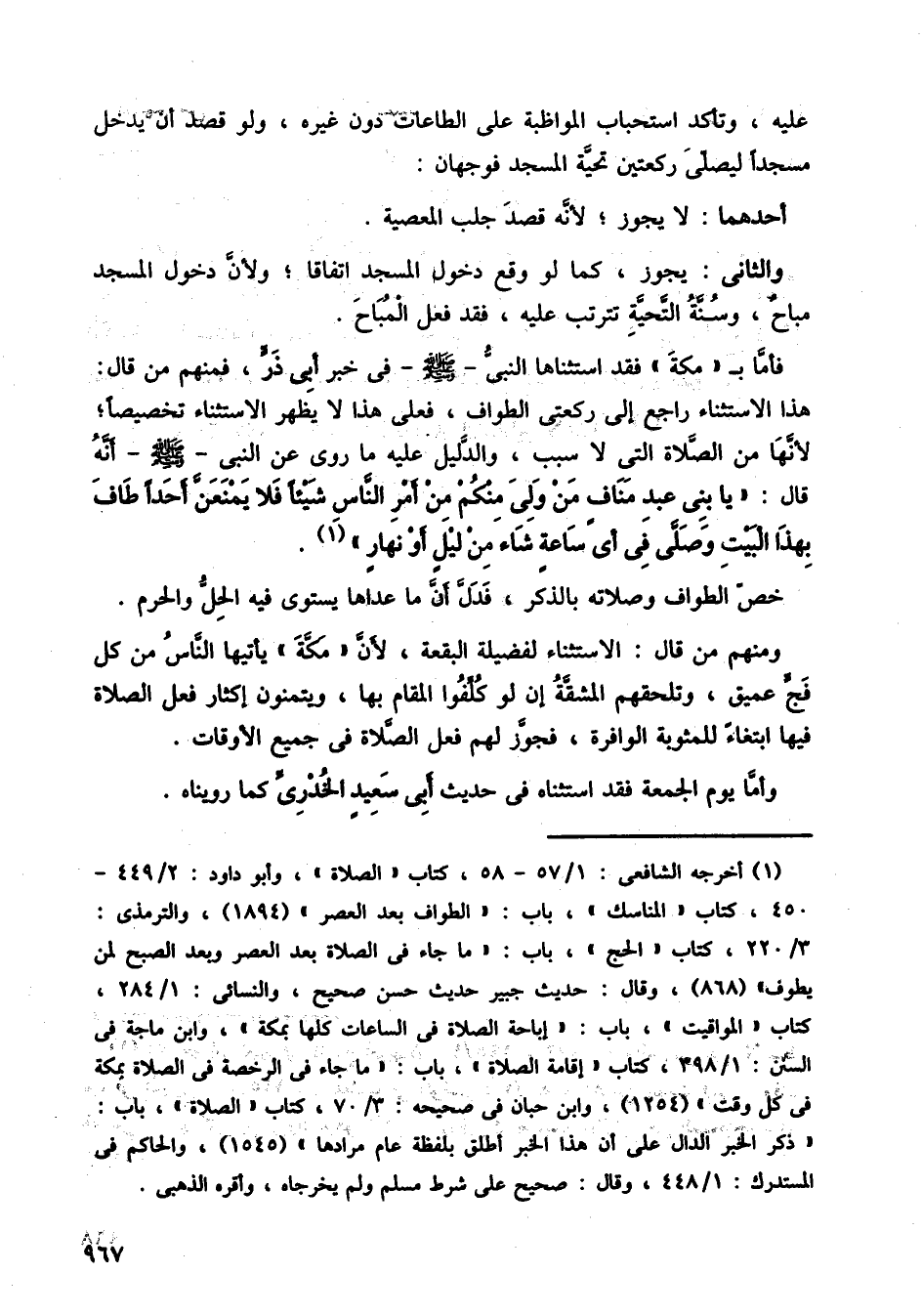 فأما بـ (مكة) فقد استثناها النبي صلى الله عليه وسلم في خبر أبي ذر، فمنهم من قال: هذا الاستثناء راجع إلى ركعتي الطواف، فعلى هذا لا يظهر الاستثناء تخصيصًا لأنها من الصلاة التي لا سبب، والدليل عليه ما روى عن النبي صلى الله عليه وسلم أنه قال: يا بني عبد مناف، من ولي منكم من أمر الناس شيئًا، فلا يمنعن أحدا طاف بهذا البيت وصلي في أي ساعة شاء من ليل أو نهار.