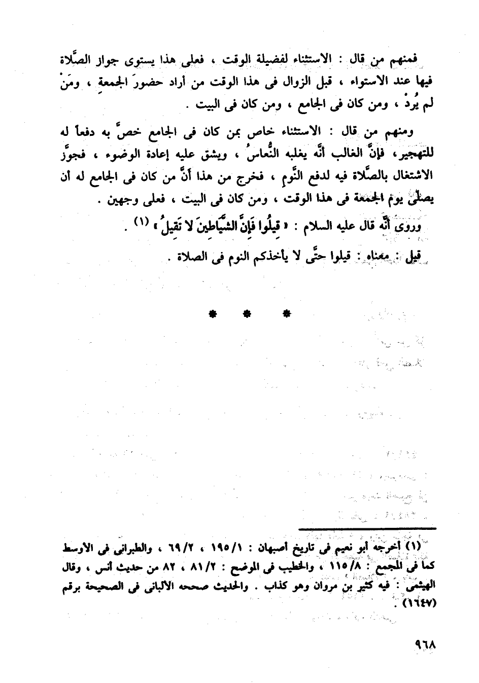 ومنهم من قال: الاستثناء خاص بمن كان في الجامع خص به دفعا له للتهجير فإن الغالب أنه يغلبه النعاس، ويشق عليه إعادة الوضوء، فجوز الاستغاال، بالصلاة فيه لدفع النوم، فخرج من هذا أن من كان في الجامع له أن يصلي يوم الجمعة في هذا الوقت، ومن كان في البيت فعلى وجهين: