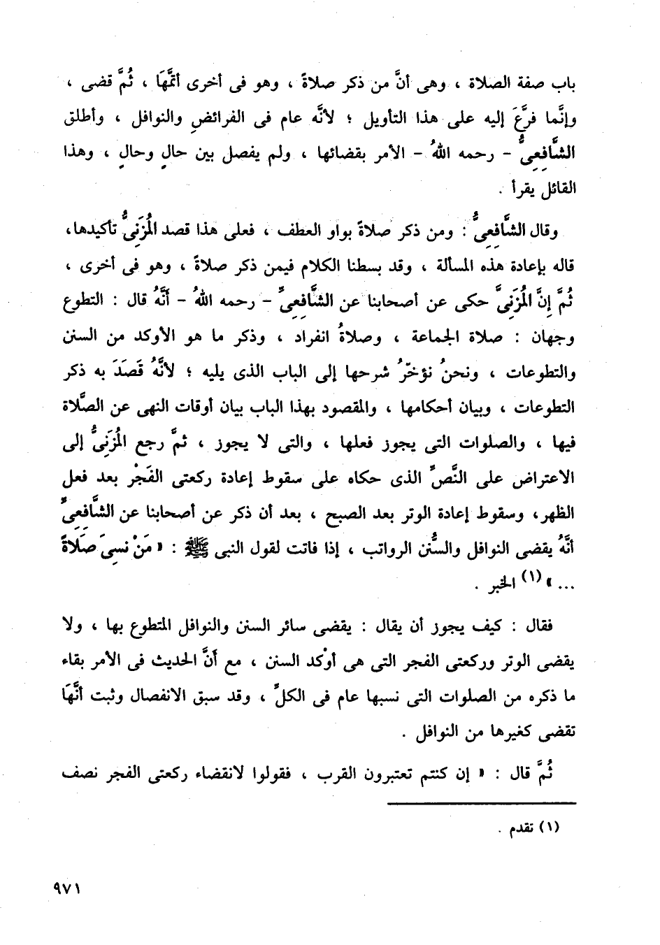 وقال الشافعي: ومن ذكر صلاة بواو العطف، فعلى هذا قصد المزني تأكيدها، قاله بإعادة هذه المسألة، وقد بسطنا الكلام فيمن ذكر صلاة، وهو في أخرى ثم إن المزني حكي عن أصحابنا عن الشافعي رحمه الله أنه قال: التطوع وجهان: صلاة الجماعة، وصلاة انفراد، وذكر ما هو الأوكد من السنن والتطوعات، ونحن نؤخر شرحها إلى الباب الذي يليه، لأنه قصد به ذكر التطوعات وبيان أحكامها، والمقصود بهذا الباب بيان أوقات النهي عن الصلاة فيها، والصلوات التي يجوز فعلها، والتي لا يجوز، ثم رجع المزني إلى الاعتراض على النص الذي حكاه على سقوط إعادة ركعتي الفجر بعد فعل الظهر، وسقوط إعادة الوتر بعد الصبح، بعد أن ذكر عن أصحابنا عن الشافعي أنه يقضي النوافل والسنن الرواتب، إذا فاتت لقول النبي صلى الله عليه وسلم / من نسي صلاة. .. الخبر.