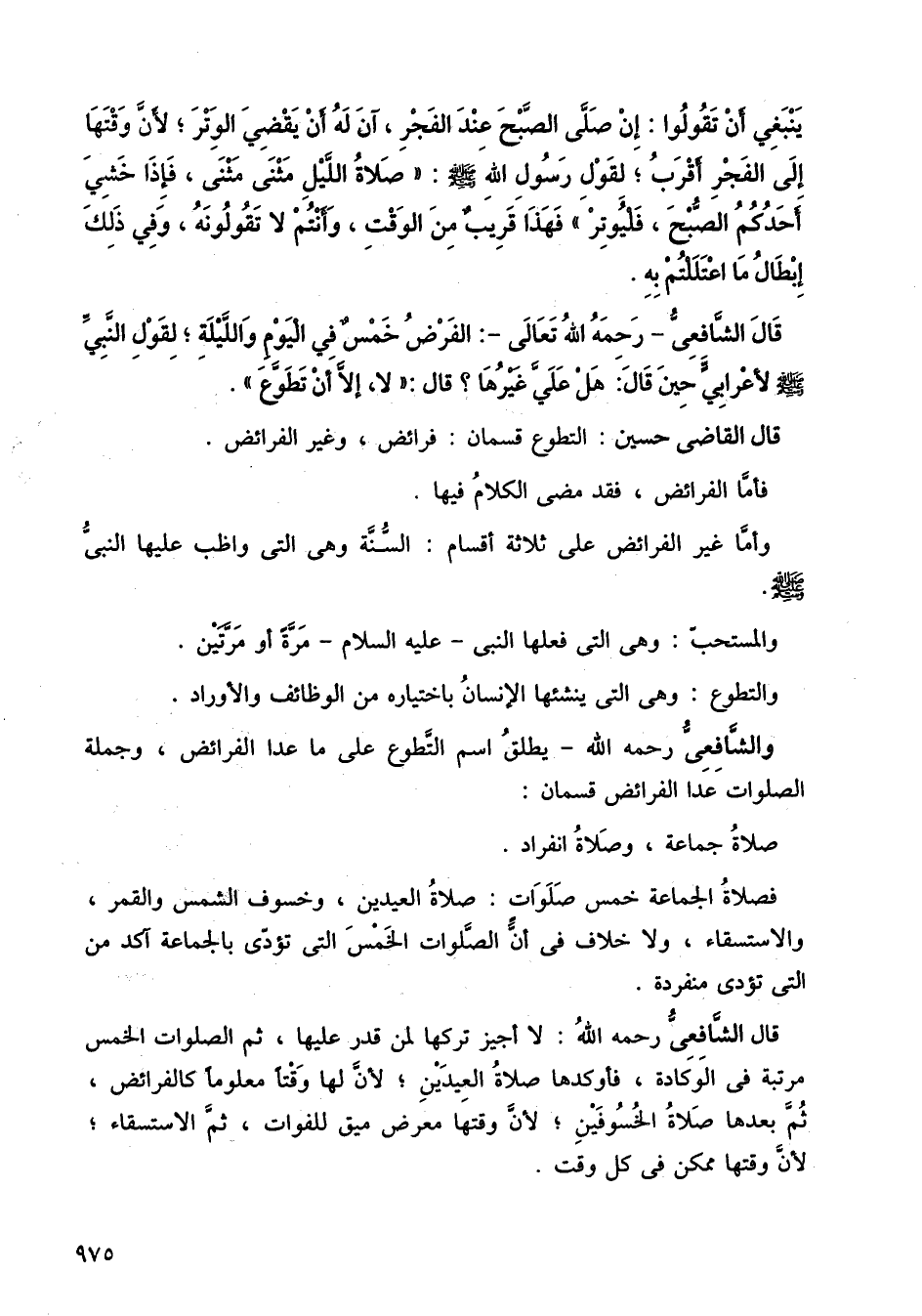 قال الشافعي رحمه الله تعالى الفرض خمس في اليوم والليلة: لقول النبي صلى الله عليه وسلم لأعرابي حين قال: هل على غيرها؟ قال: لا، إلا أن تطوع.