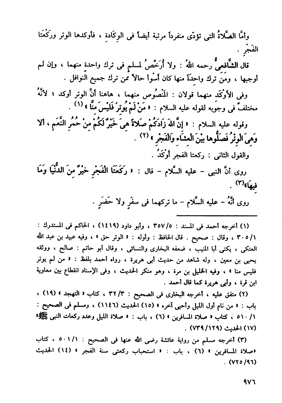 قال الشافعي رحمه الله: ولا أرخص لمسلم في ترك واحدة مهما، وإن لم أوجبها، ومن ترك واحدة منها كان أسوأ حالا ممن ترك جميع النوافل.