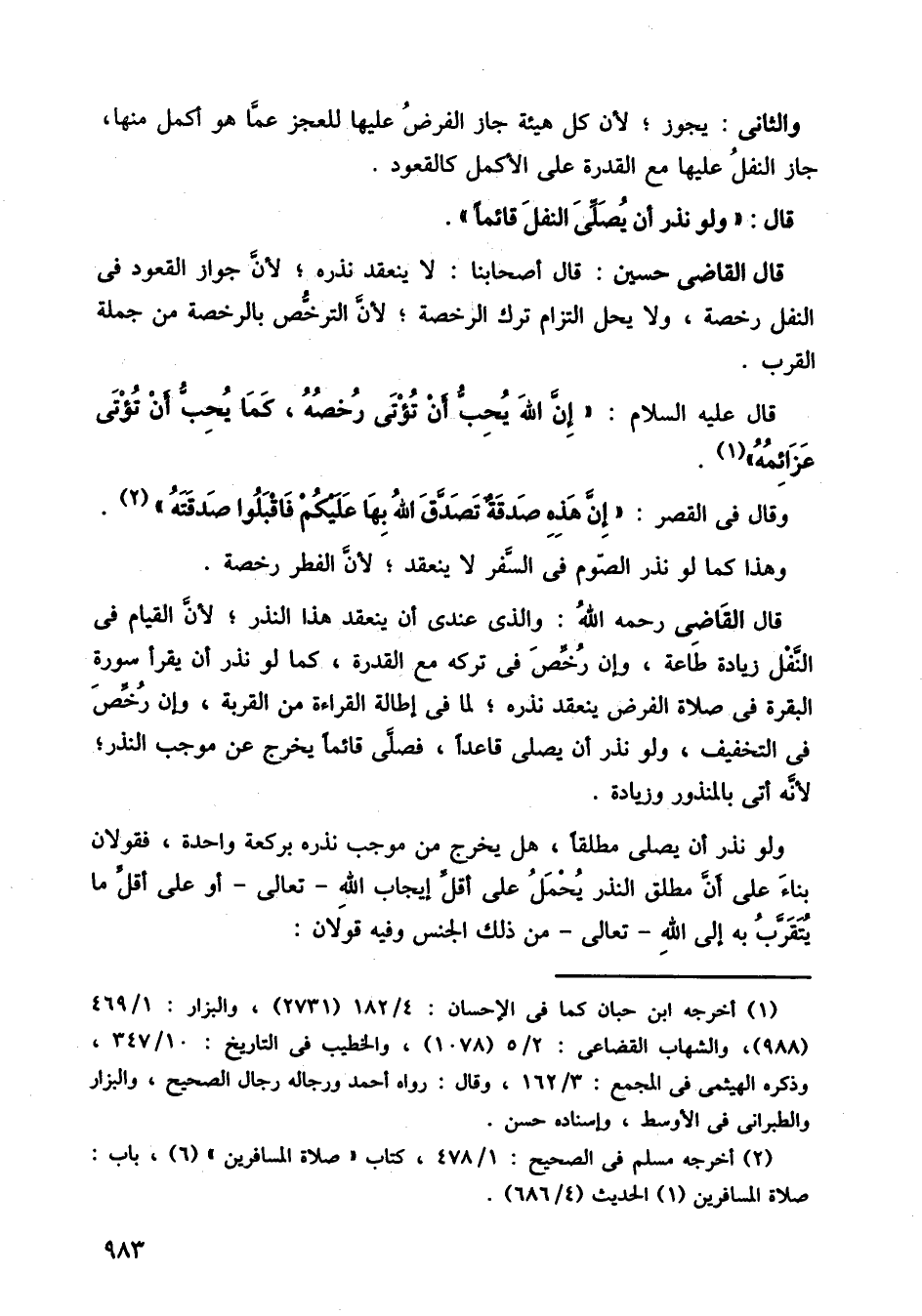قال القاضي رحمه الله: والذي عندي أن ينعقد هذا النذر، لأن القيام في النفل زيادة طاعة، وإن رخص في تركه مع القدرة، كما لو نذر أن يقرأ سورة البقرة في صلاة الفرض ينعقد نذره، لما في إطالة القراءة من القرية، وإن رخص في التخفيف، ولو نذر أن يصلي قاعدًا، فصلي قائمًا يخرج عن موجب النذر، لأنه أتى بالمنذور وزيادة.