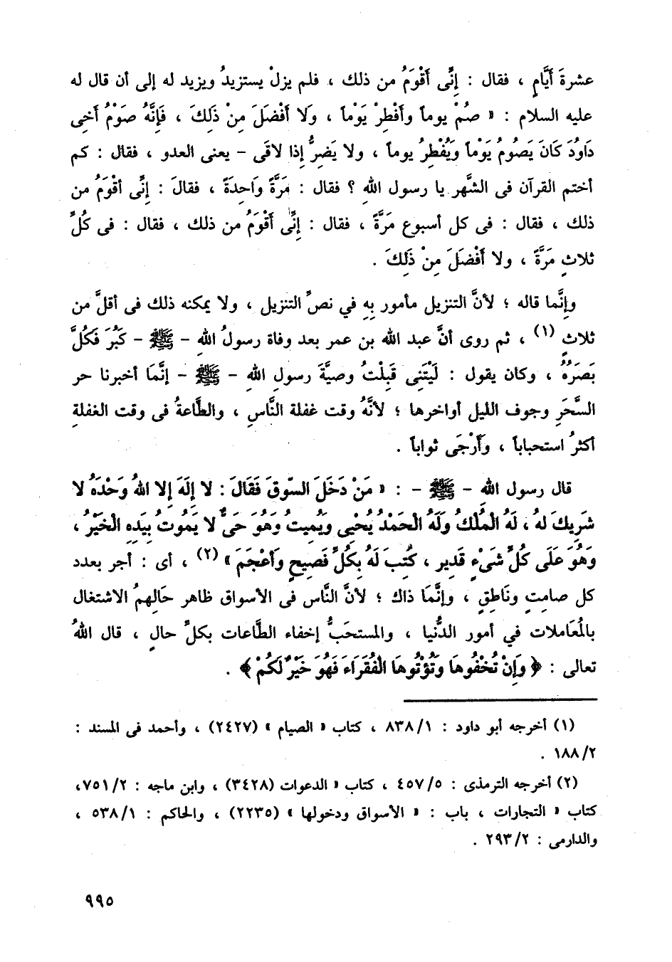 عشرة أيام، فقال: إني أقوم من ذلك، فلم يزل يستزيد ويزيد له إلى أن قال له عليه السلام: صوم يومًا وأفطر يومًا، ولا أفضل من ذلك، فإنه صوم أخي داود كان يصوم يومًا ويفطر يومًا، ولا يضر إذا لاقى يعني العدو، فقال: كم أختم القرآن في الشهر يا رسول الله؟ فقال: مرة واحدة، فقال: إني أقوم من ذلك، فقال: في كل أسبوع مرة، فقال: إني أقوم من ذلك، فقال: في كل ثلاث مرة، ولا أفضل من ذلك.