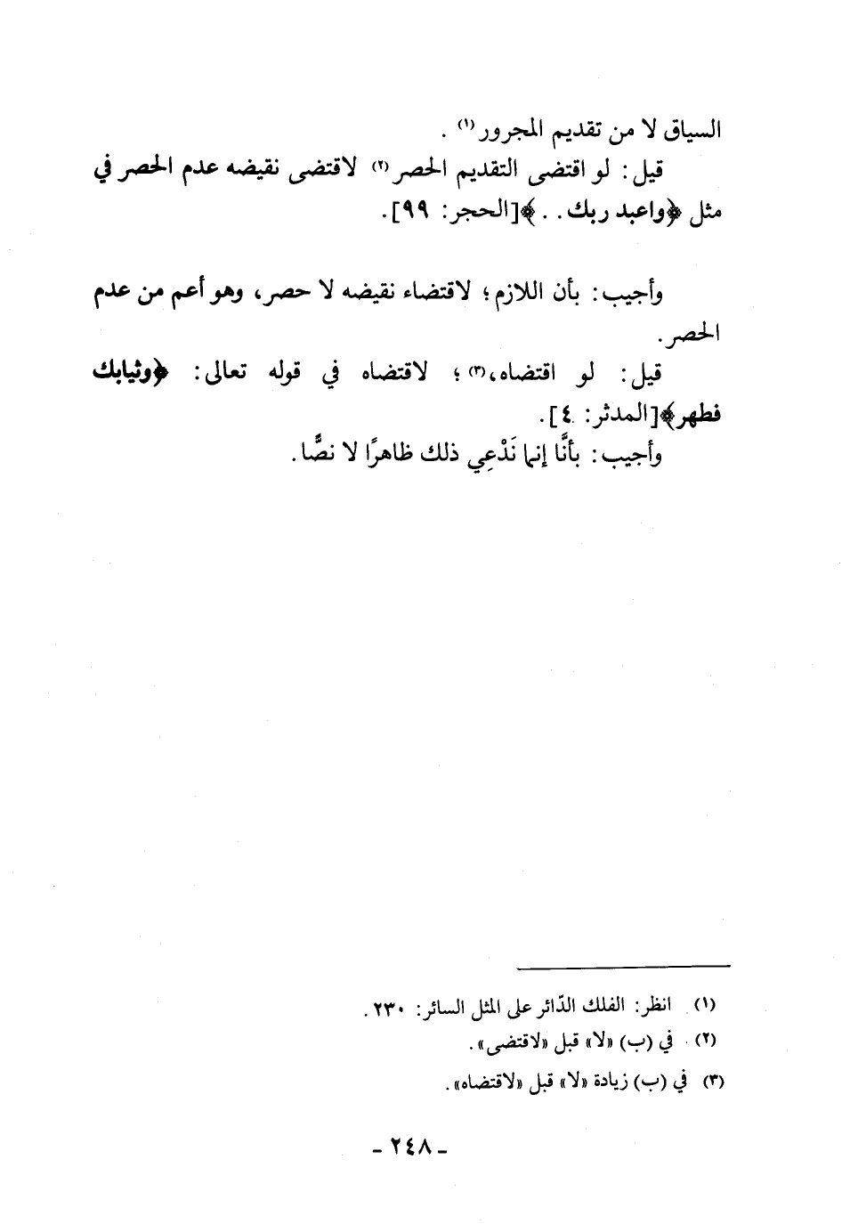 قيل: لو اقتضى التقديم الحصر لاقتضى نقيضه عدم الحصر في مثل (وَاعْبُدْ رَبَّكَ).