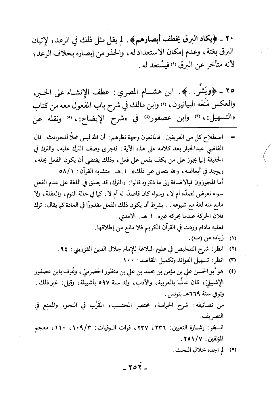 25 - (وبَشِّر. .). ابن هشام المصري: عطف الإِنشاء على الخبر، والعكس مَنَعَه البيانيون، وابن مالك في شرح باب المفعول معه من كتاب " التسهيل "، وابن عصفور في " شرح الإِيضاح "، ونقله عن
