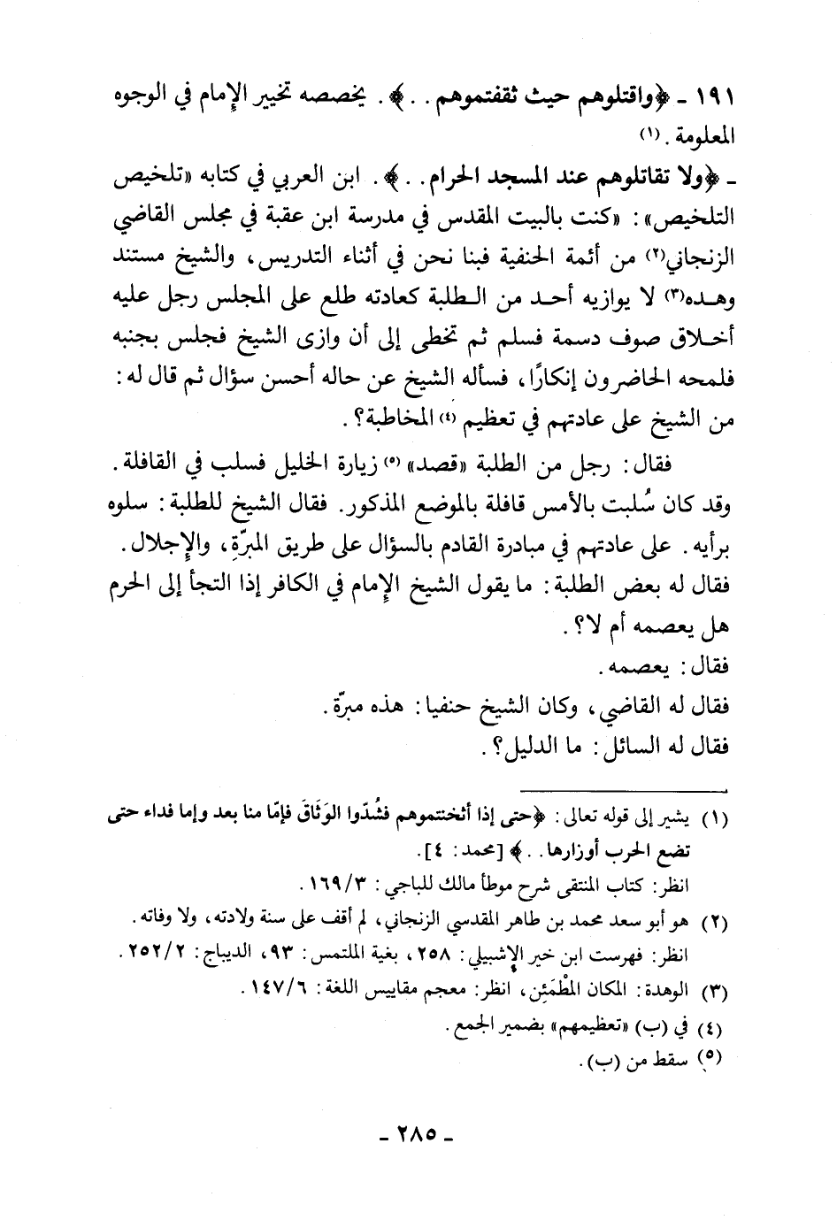 - (ولا تقاتلوهم عند المسجد الحرام. .). ابن العربي في كتابه " تلخيص التلخيص ": " كنت بالبيت المقدس في مدرسة ابن عقبة في مجلس القاضي الزنجاني من أئمة الحنفية [فبينا] نحن في أثناء التدريس، والشيخ مستند وهده لا يوازيه أحد من الطلبة كعادته طلع على المجلس رجل عليه أخلاق صوف دسمة فسلم ثم تخطى إلى أن وازى الشيخ فجلس بجنبه فلمحه الحاضرون إنكارًا، فسأله الشيخ عن حاله أحسن سؤال ثم قال له: من الشيخ على عادتهم في تعظيم المخاطبة؟.