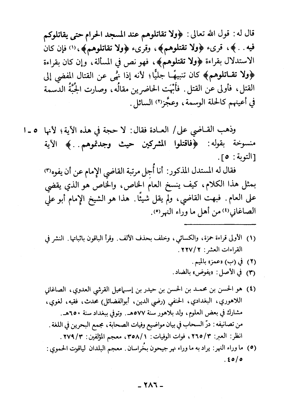قال له: قول الله تعالى: (وَلَا تُقَاتِلُوهُمْ عِنْدَ الْمَسْجِدِ الْحَرَامِ حَتَّى يُقَاتِلُوكُمْ فِيهِ. .)، قرئ (ولا تقتلوهم)، وقرئ (ولا تقاتلوهم)، فإن كان الاستدلال بقراءة (ولا تقتلوهم)، فهو نص في المسألة، وإن كان بقراءة (ولا تقاتلوهم) كان تنبيهًا جليًّا، لأنه إذا نهُى عن القتال المفضي إلى القتل، فأولى عن القتل. فأبْهَت الحاضرين مقالُه، وصارت الجُبَّةُ الدسمة في أعينهم كالحلة الوسمة، وعجَّز السائل.