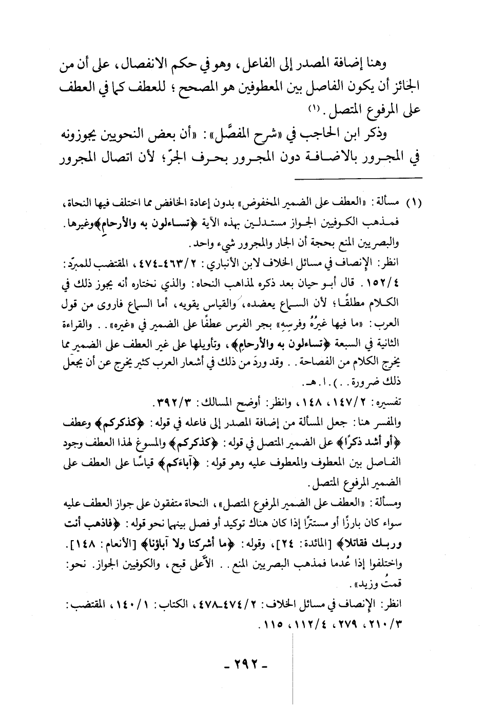 وهنا إضافة المصدر إلى الفاعل، وهو في حكم الانفصال، على أن من الجائز أن يكون الفاصل بين المعطوفين هو المصحح، للعطف كما في العطف على المرفوع المتصل.