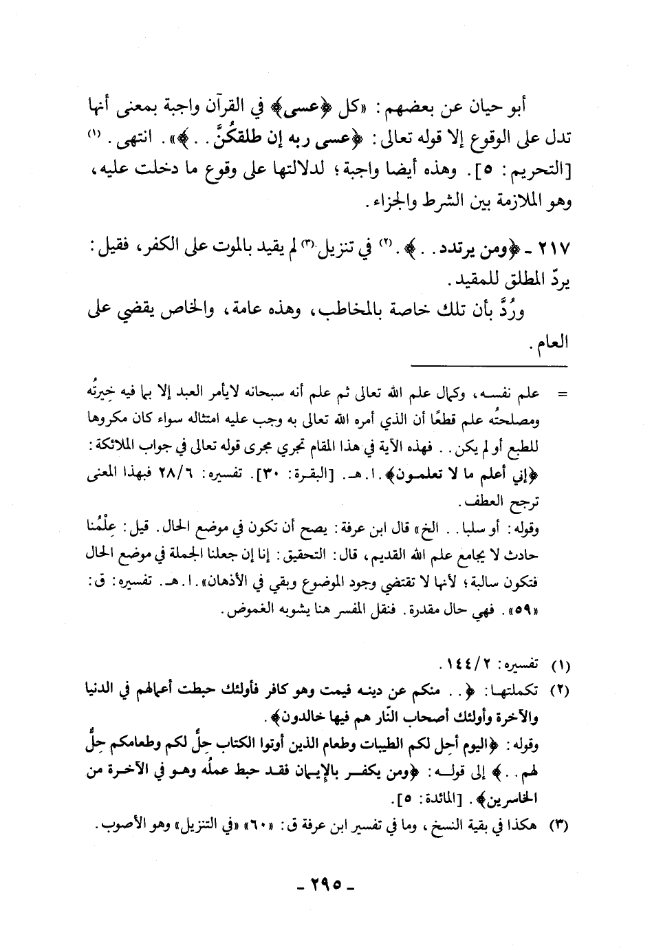 217 - (وَمَنْ يَرْتَدِدْ. .). في تنزيل. لم يقيد بالموت على الكفر، فقيل: يردّ المطلق للمقيد.