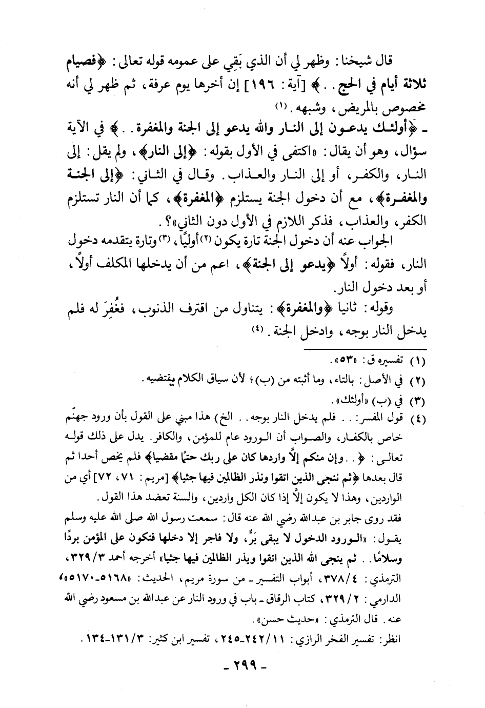 - (أُولَئِكَ يَدْعُونَ إِلَى النَّارِ وَاللَّهُ يَدْعُو إِلَى الْجَنَّةِ وَالْمَغْفِرَةِ). . في الآية سؤال، وهو أن يقال: " اكتفى في الأول بقوله: (إلى النار)، ولم يقل: إلى النار، والكفر، أو إلى النار والعذاب. وقال في الثاني: (إِلَى الْجَنَّةِ وَالْمَغْفِرَةِ)، مع أن دخول الجنة يستلزم (المغفرة)، كما أن النار تستلزم الكفر، والعذاب، فذكر اللازم في الأول دون الثاني "؟.
