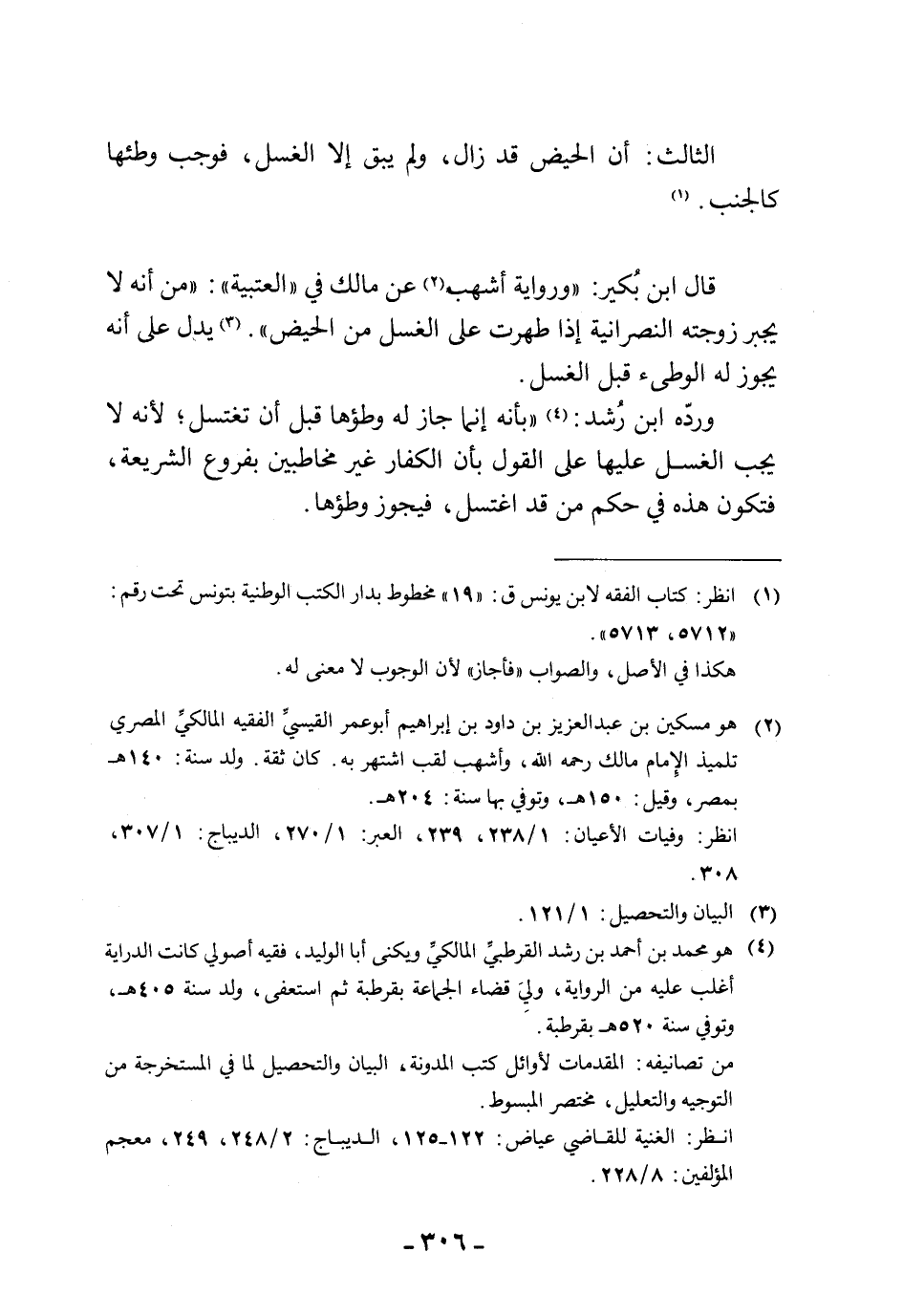 قال ابن بُكير: " ورواية أشهب عن مالك في " العتبية ": " من أنه لا يجبر زوجته النصرانية إذا طهرت على الغسل من الحيض ". يدل على أنه يجوز له الوطىء قبل الغسل.