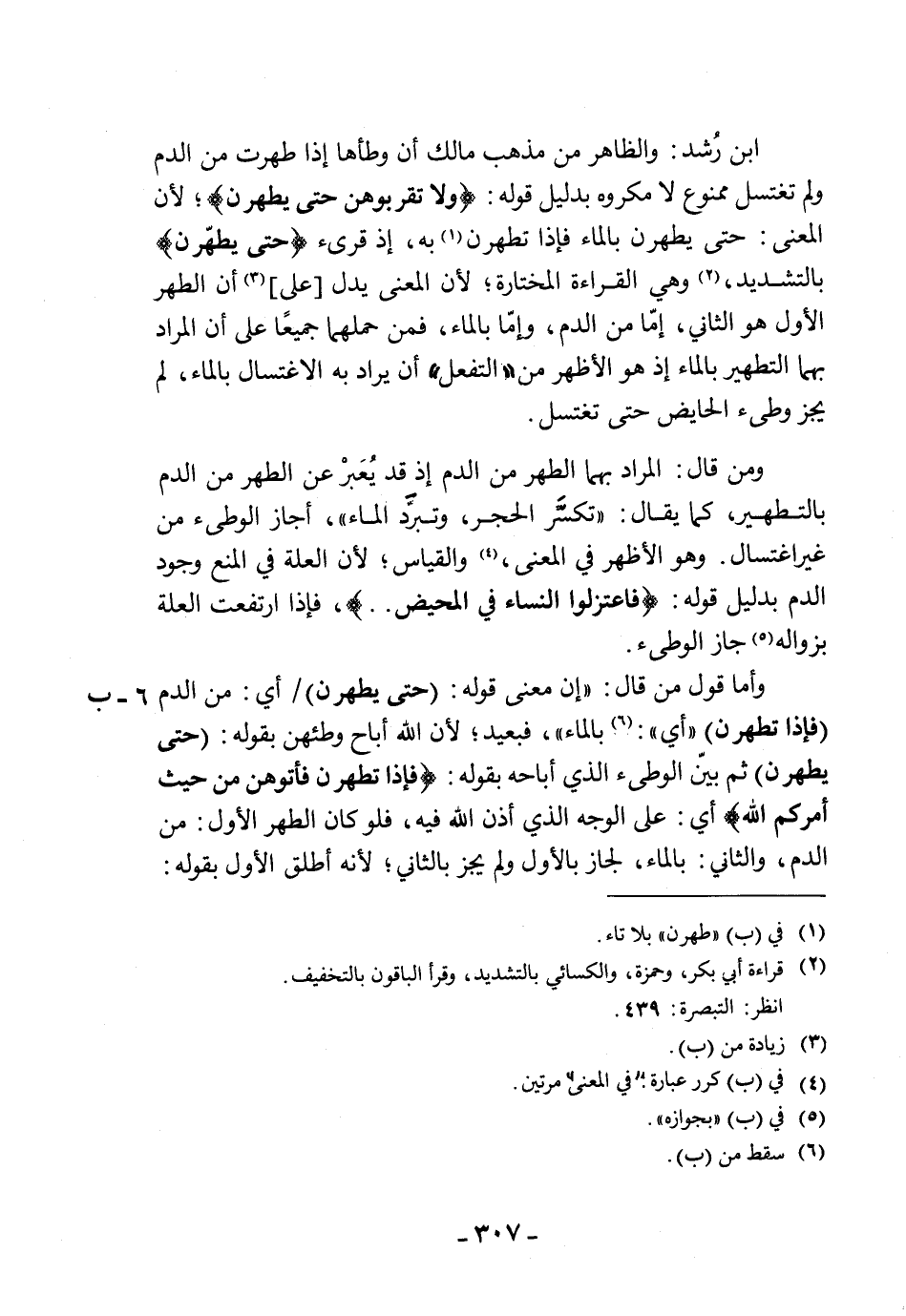 ابن رُشد: والظاهر من مذهب مالك أن وطأها إذا طهرت من الدم ولم تغتسل ممنوع لا مكروه بدليل قوله: (ولاتقربوهن حتى يطهرن)؛ لأن المعنى: حتى يطهرن بالماء فإذا تطهرن به، إذ قرئ (حتى يطهَّرن) بالتشديد، وهي القراءة المختارة؛ لأن المعنى يدل على أن الطهر الأول هو الثاني، إمّا من الدم، وإمّا بالماء، فمن حملهما جميعًا على أن المراد بهما التطهير بالماء إذ هو الأظهر من " التفعل " أن يراد به الاغتسال بالماء، لم يجز وطىء الحائض حتى تغتسل.