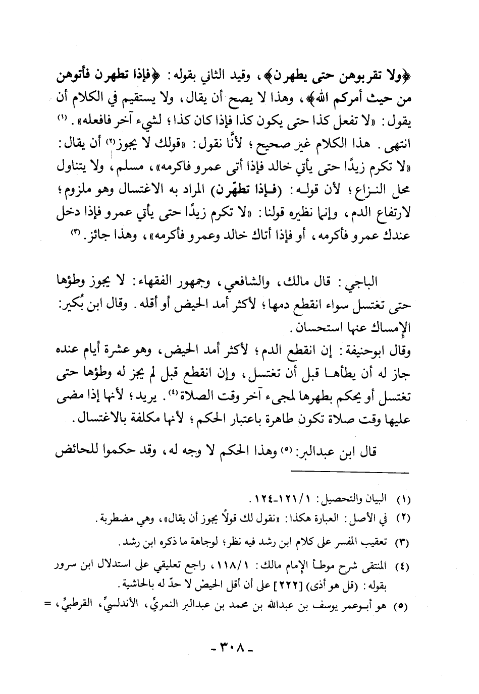 (وَلَا تَقْرَبُوهُنَّ حَتَّى يَطْهُرْنَ)، وقيد الثاني بقوله: (فَإِذَا تَطَهَّرْنَ فَأْتُوهُنَّ مِنْ حَيْثُ أَمَرَكُمُ اللَّهُ)، وهذا لا يصح أن يقال، ولا يستقيم في الكلام أن يقول: " لا تفعل كذا حتى يكون كذا فإذا كان كذا؛ لشيء آخر فافعله ".