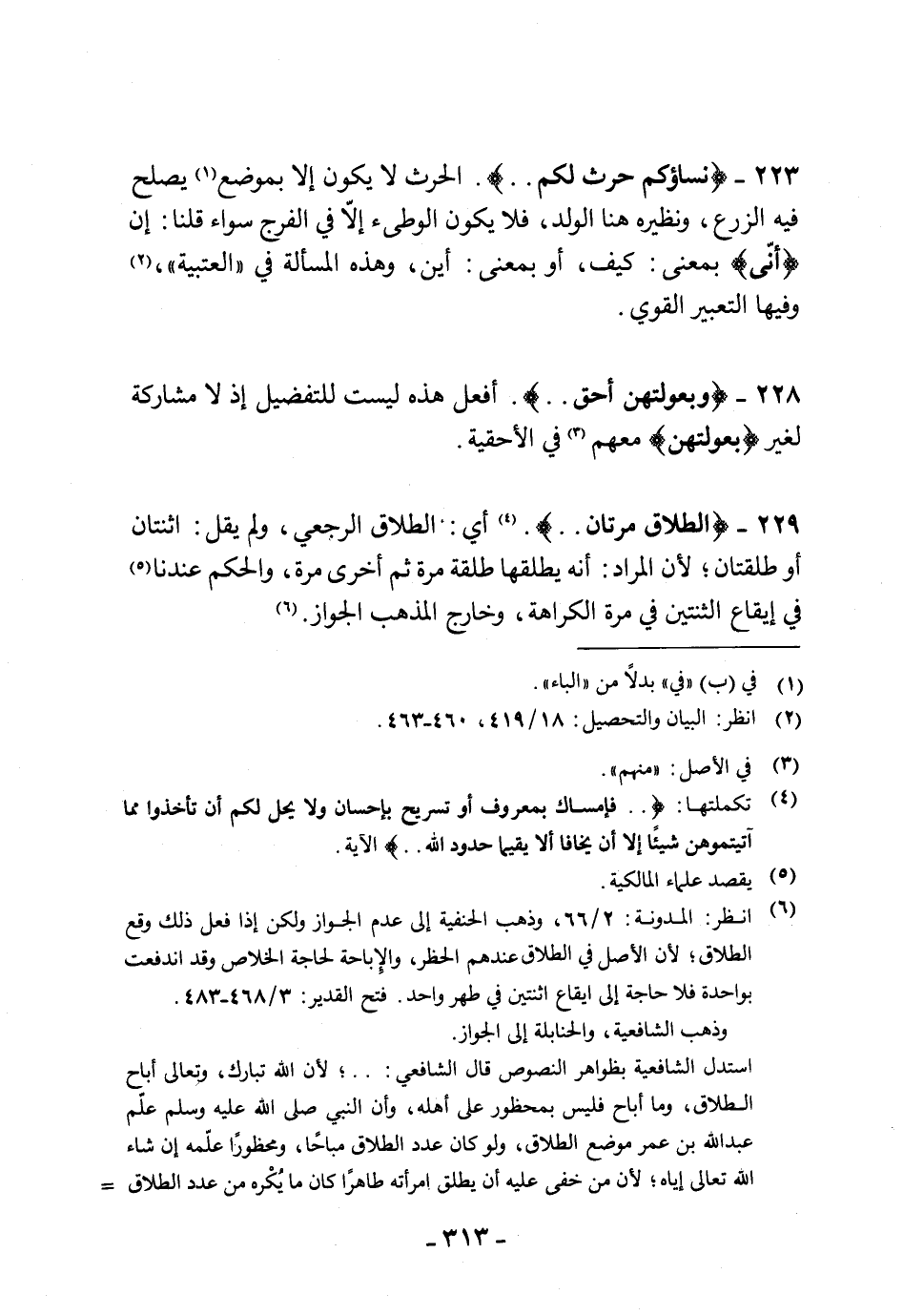229 - (الطَّلَاقُ مَرَّتَانِ. .). أي: الطلاق الرجعي، ولم يقل: اثنتان أو طلقتان؛ لأن المراد: أنه يطلقها طلقة مرة ثم أخرى مرة، والحكم عندنا في إيقاع الثنتين في مرة الكراهة، وخارج المذهب الجواز.