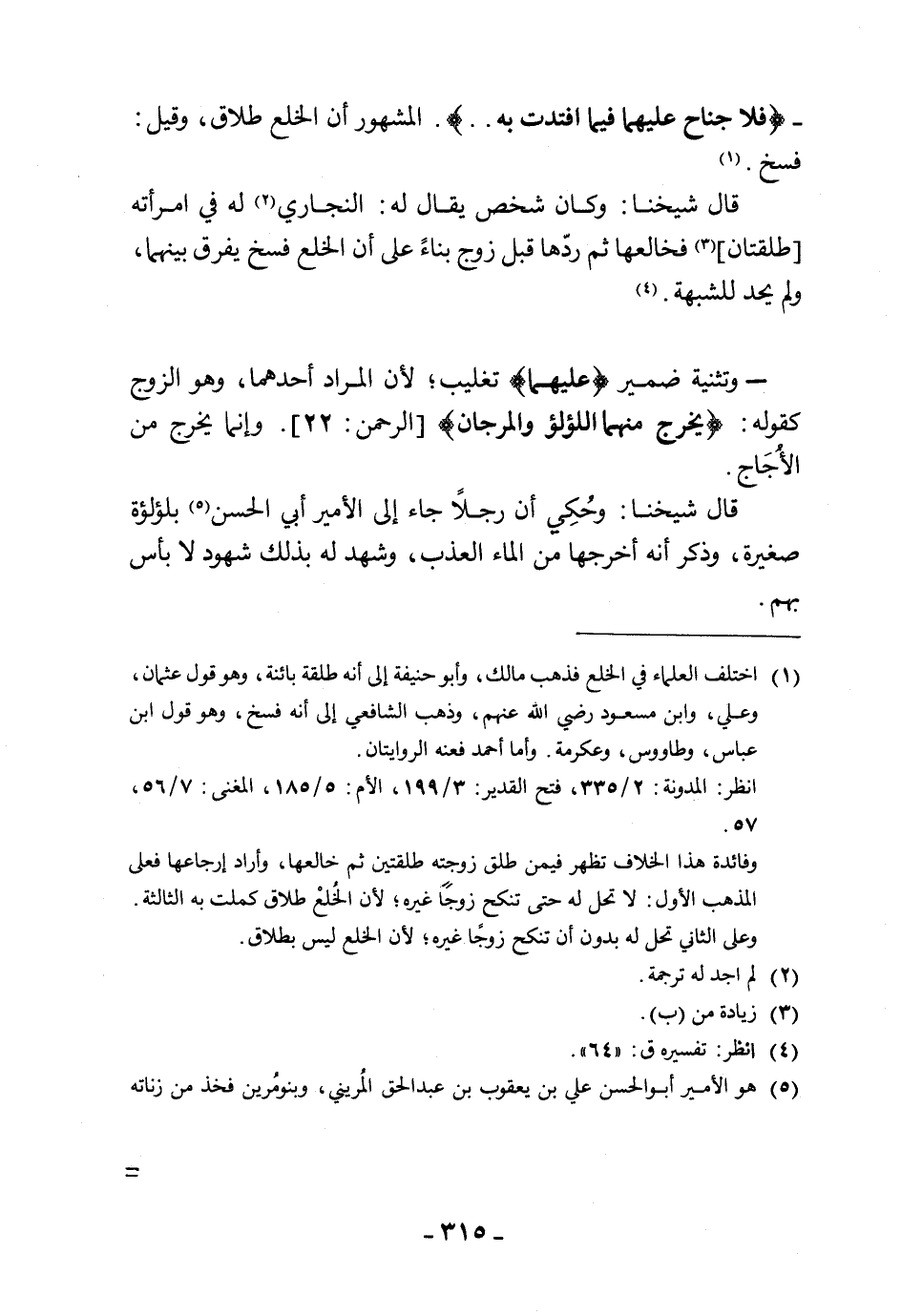 - (فَلَا جُنَاحَ عَلَيْهِمَا فِيمَا افْتَدَتْ بِهِ. .). المشهور أن الخلع طلاق، وقيل: فسخ.