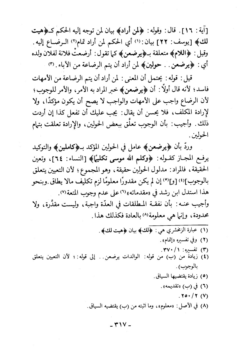 قيل: قوله: يحتمل أن المعنى: لمن أراد أن يتم الرضاعة من الأمهات فاسد؛ لأنه قال أولًا: أن (يرضعن) خبر المراد به الأمر، والأمر للوجوب؛ لأن الرضاع واجب على الأمهات والواجب لا يصح أن يكون مؤكدًا، ولا لإِرادة المكلف، فلا يحسن أن يقال: يجب عليك أن تفعل كذا إن أردت ذلك. وأجيب: بأن الوجوب تعلَّق ببعض الحولين، والإِرادة تعلقت بتمام الحولين.