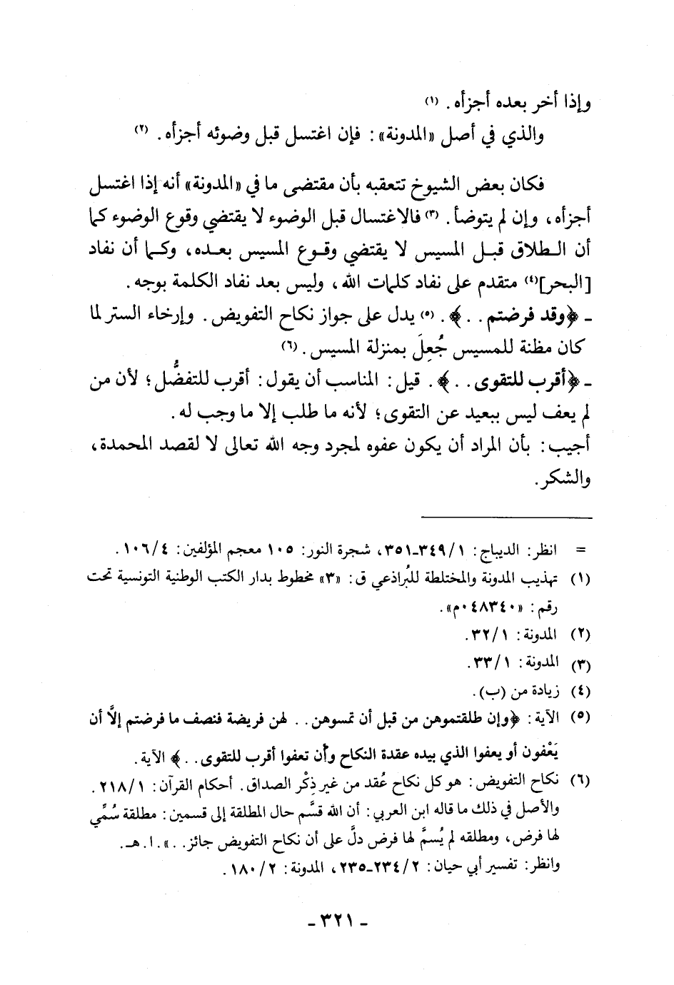 فكان بعض الشيوخ تتعقبه بأن مقتضى ما في " المدونة، أنه إذا اغتسل أجزأه، وإن لم يتوضأ. فالاغتسال قبل الوضوء لا يقتضي وقوع الوضوء كما أن الطلاق قبل المسيس لا يقتضي وقوع المسيس بعده، وكما أن نفاد البحر متقدم على نفاد كلمات اللَّه، وليس بعد نفاد الكلمة بوجه.