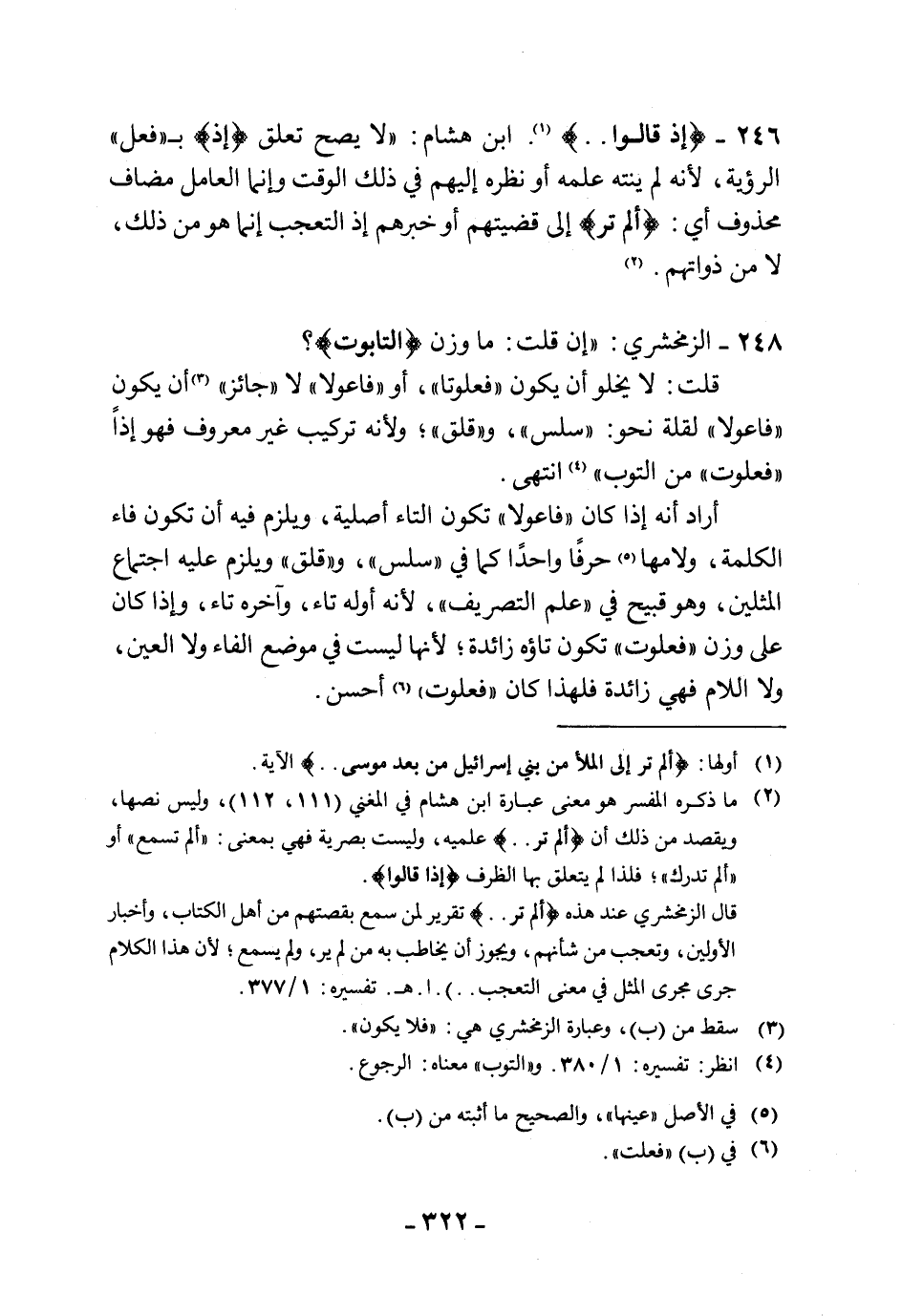 246 - (إذ قالوا. .) ابن هشام: " لا يصح تعلق (إذ) بـ (فعل) الرؤية، لأنه لم ينته علمه أو نظره إليهم في ذلك الوقت وإنما العامل مضاف محذوف أي: (ألم تر) إلى قضيتهم أو خبرهم إذ التعجب إنما هو من ذلك، لا من ذواتهم.