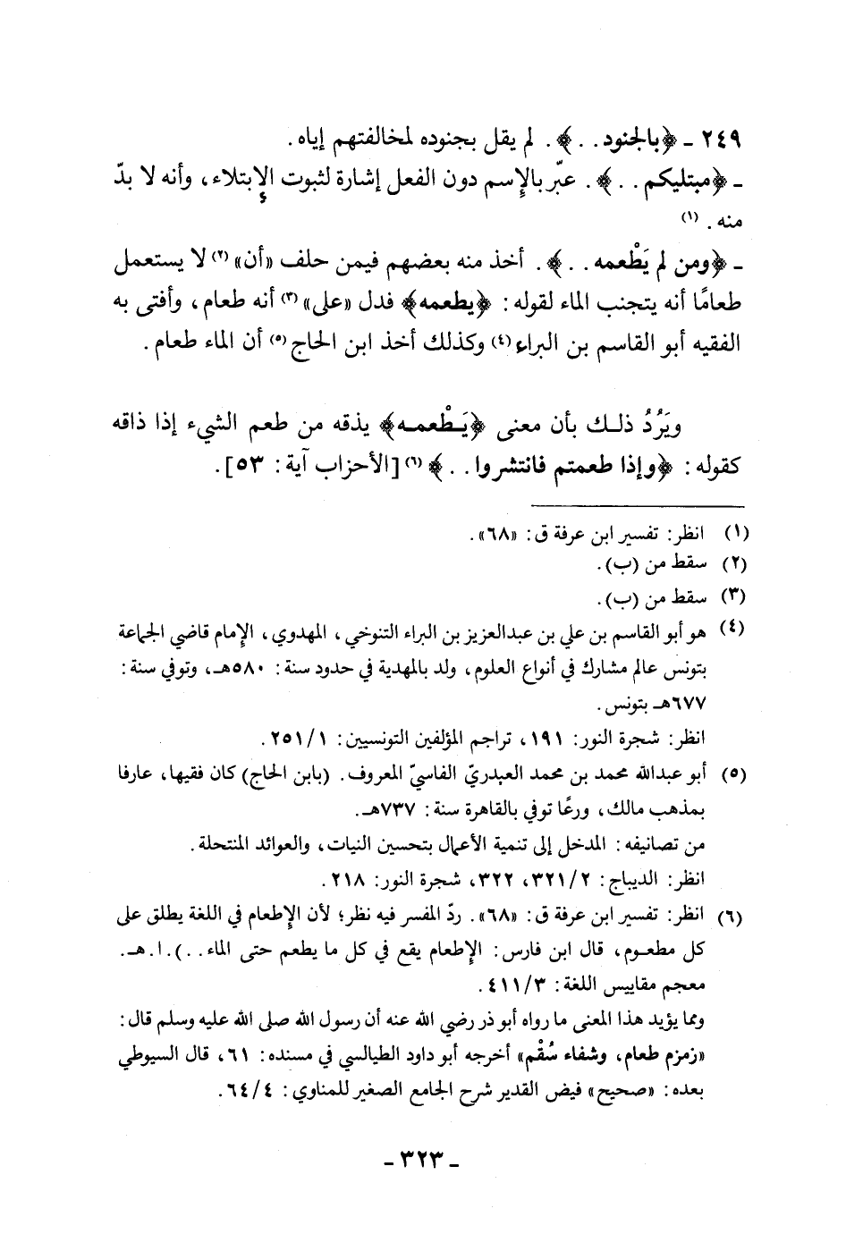 - (ومن لم يَطْعمه. .). أخذ منه بعضهم فيمن حلف أن لا يستعمل طعامًا أنه يتجنب الماء لقوله: (يطعمه) فدل " على " أنه طعام، وأفتى به الفقيه أبو القاسم بن البراء وكذلك أخذ ابن الحاج أن الماء طعام.