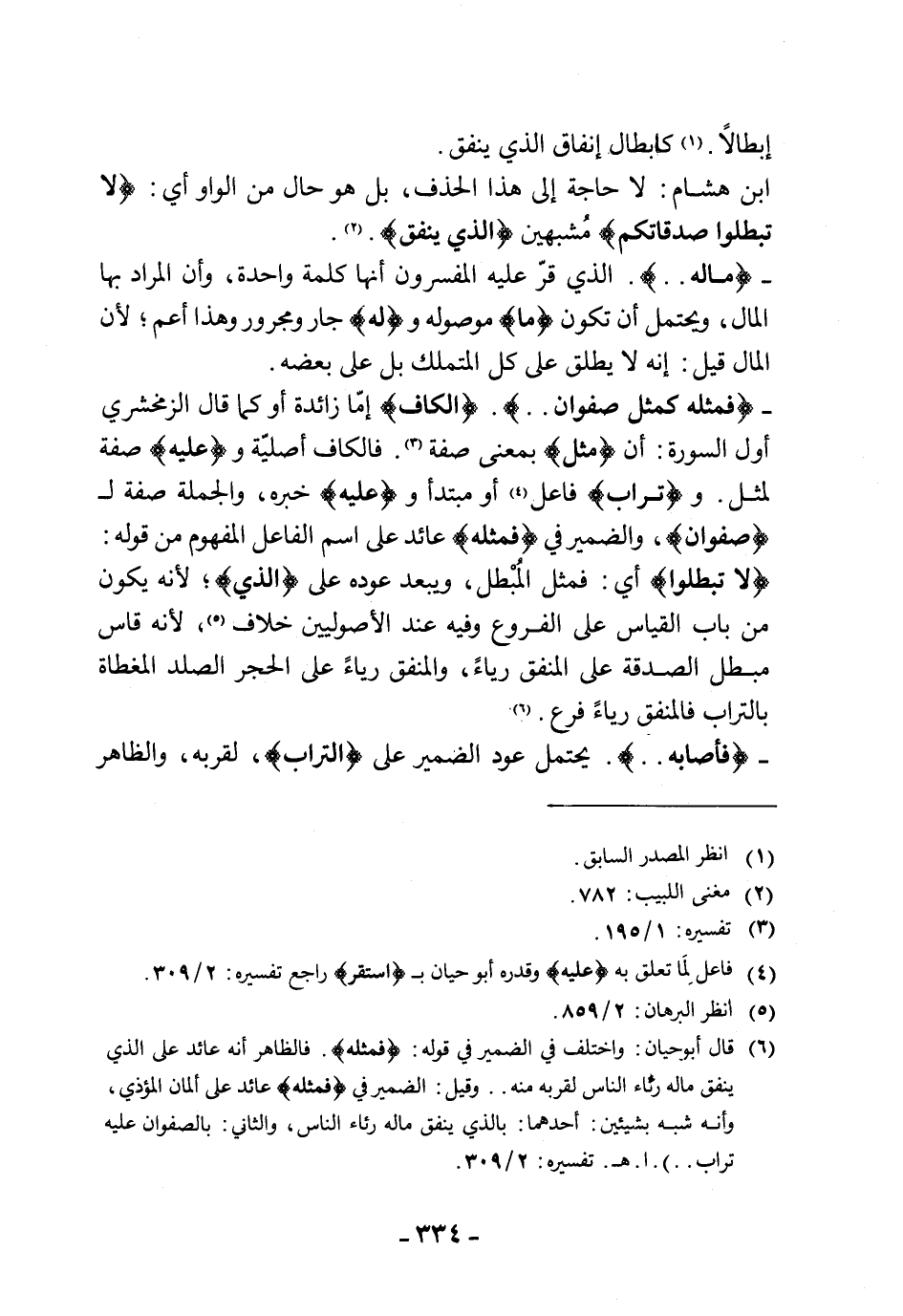 ابن هشام: لا حاجة إلى هذا الحذف، بل هو حال من الواو أي: (لا تبطلوا صدقاتكم) مُشبهين (الذي ينفق).