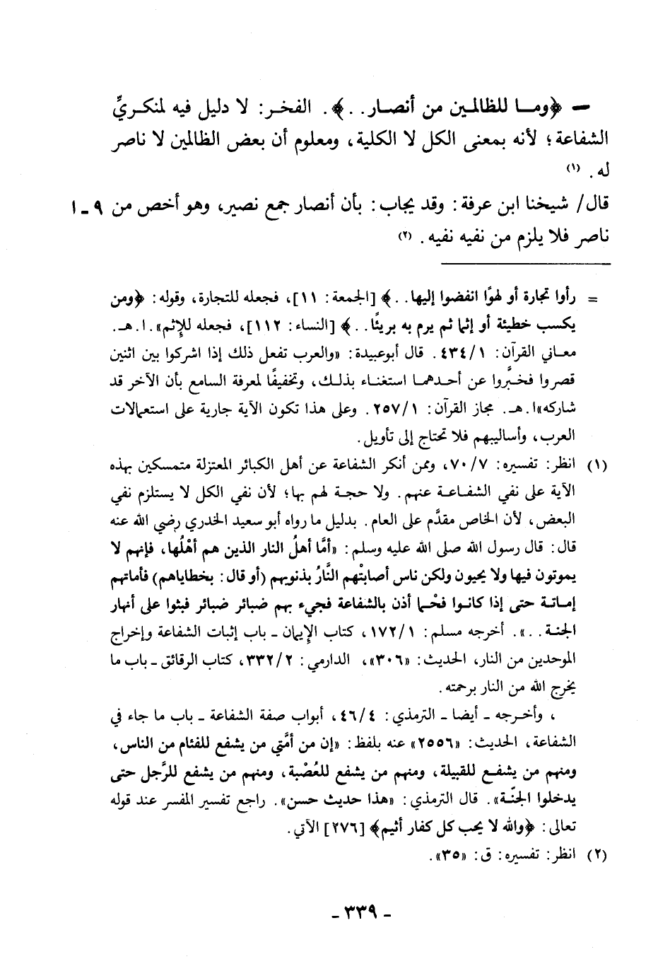 - (وما للظالمين من أنصار. .). الفخر: لا دليل فيه لمنكري الشفاعة؛ لأنه بمعنى الكل لا الكلية، ومعلوم أن بعض الظالمين لا ناصر له.