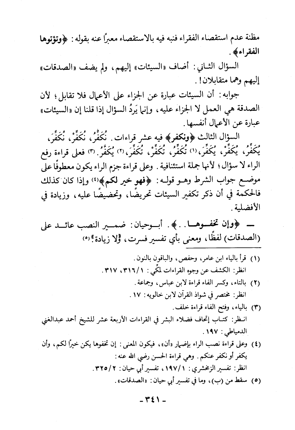 - (وإن تخفوها. .). أبو حيان: ضمير النصب عائد على (الصدقات) لفظًا، ومعنى بأي تفسير فسرت، " ولا زيادة ".