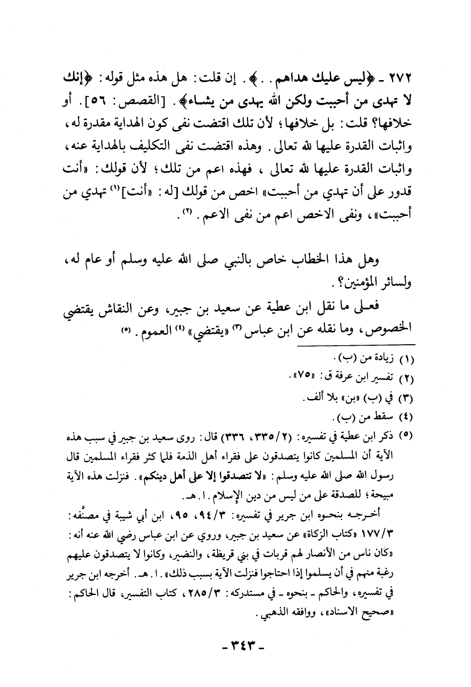 272 - (ليس عليك هداهم. .). إن قلت: هل هذه مثل قوله: (إِنَّكَ لَا تَهْدِي مَنْ أَحْبَبْتَ وَلَكِنَّ اللَّهَ يَهْدِي مَنْ يَشَاءُ). أو خلافها؟ قلت: بل خلافها؛ لأن تلك اقتضت نفى كون الهداية مقدرة له، وإثبات القدرة عليها لله تعالى. وهذه اقتضت نفى التكليف بالهداية عنه، وإثبات القدرة عليها لله تعالى، فهذه أعم من تلك؛ لأن قولك: " أنت قدور على أن تهدي من أحببت " أخص من قولك له: " أنت تهدي من أحببت "، ونفى الأخص أعم من نفى الأعم.