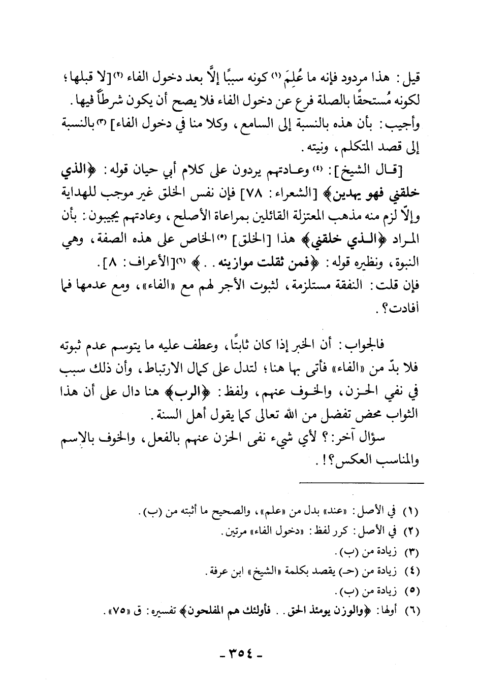 قال الشيخ: وعادتهم يردون على كلام أبي حيان قوله: (الذي خلقني فهو يهدين)، فإن نفس الخلق غير موجب للهداية وإلّا لزم منه مذهب المعتزلة القائلين بمراعاة الأصلح، وعادتهم يجيبون: بأن المراد (الذي خلقني) هذا الخلق الخاص على هذه الصفة، وهي النبوة، ونظيره قوله: (فمن ثقلت موازينه. .).