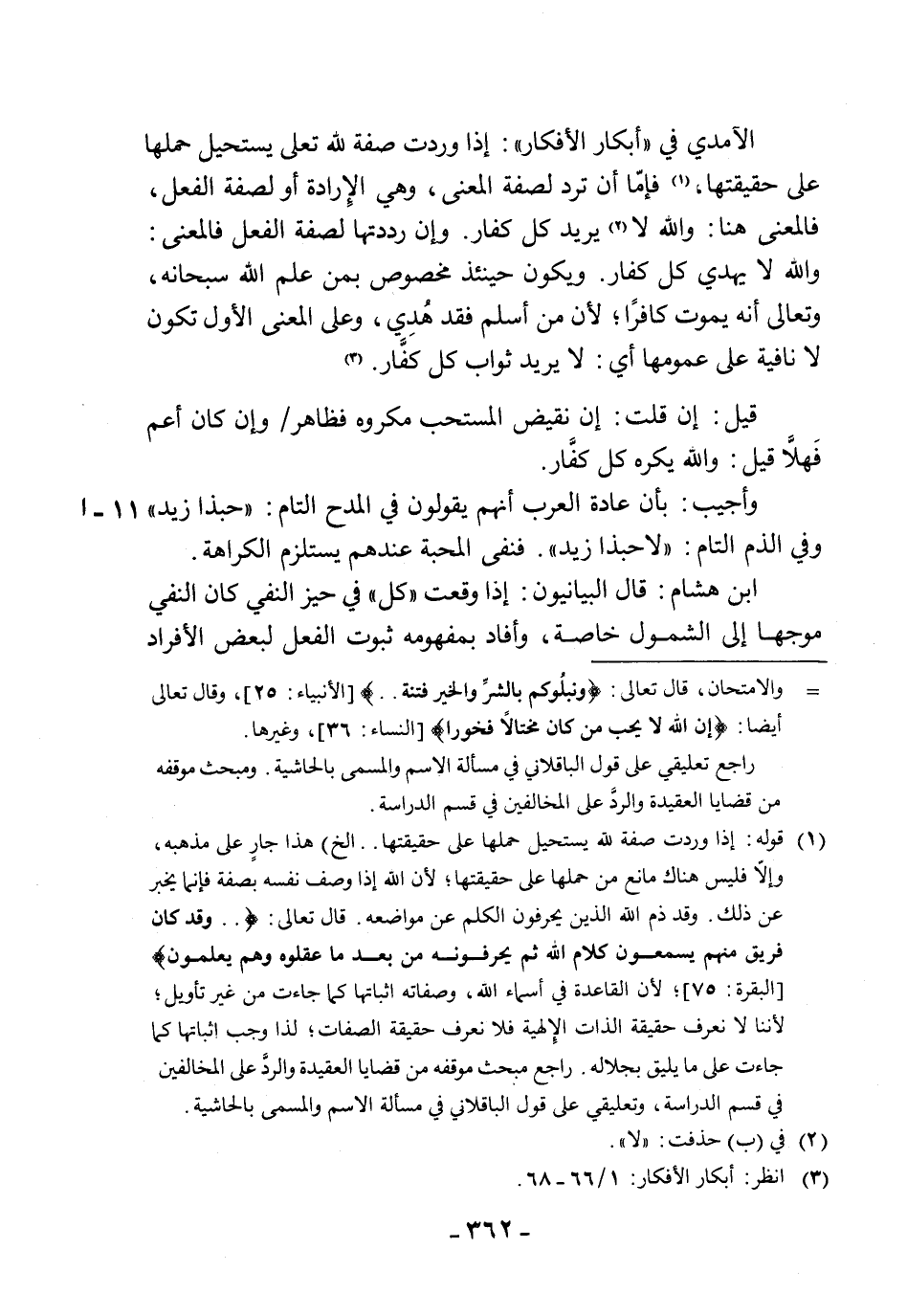 الآمدي في " أبكار الأفكار ": إذا وردت صفة لله تعالى يستحيل حملها على حقيقتها، فإمّا أن ترد لصفة المعنى، وهي الإِرادة أو لصفة الفعل، فالمعنى هنا: واللَّه لا يريد كل كفار. وإن رددتها لصفة الفعل فالمعنى: واللَّه لا يهدي كل كفار. ويكون حينئذ مخصوص بمن علم الله سبحانه، وتعالى أنه يموت كافرًا؛ لأن من أسلم فقد هُدِي، وعلى المعنى الأول تكون لا نافية على عمومها أي: لا يريد ثواب كل كفَّار.