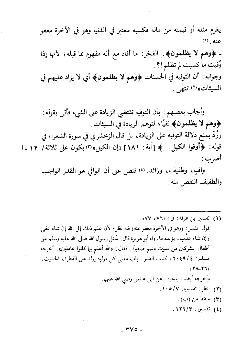 ورُدّ بمنع دلالة التوفيه على الزيادة، بل قال الزمخشري في سورة الشعراء في قوله: (أوفوا الكيل. .)، " إن الكيل " يكون على ثلاثة أضرب: