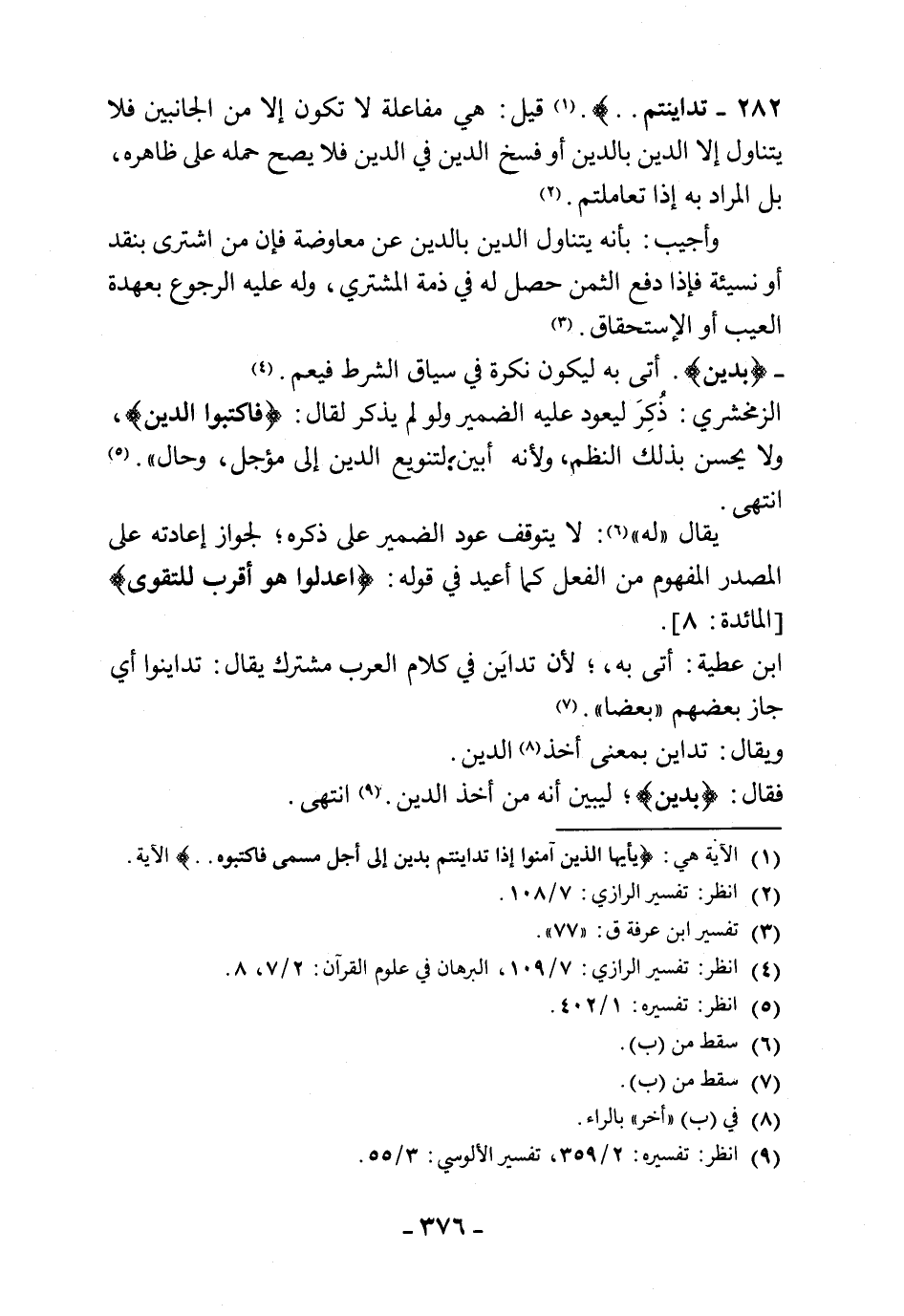 282 - (تداينتم. .). قيل: هي مفاعلة لا تكون إلا من الجانبين فلا يتناول إلا الدَّين بالدَّين أو فسخ الدَّين في الدَّين فلا يصح حمله على ظاهره، بل المراد به إذا تعاملتم.