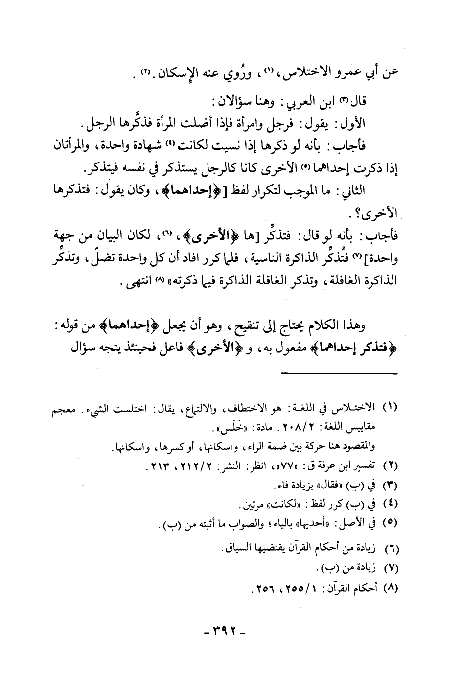 وهذا الكلام يحتاج إلى تنقيح، وهو أن يجعل (إحداهما) من قوله: (فتذكر إحداهما) مفعول به، و (الأخرى) فاعل فحينئذ يتجه سؤال