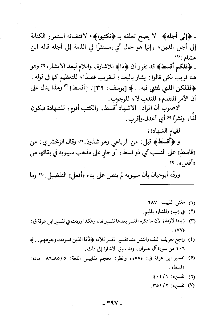 - (ذلكم أقسط) قد تقرر أن (ذا) للاشارة، واللام لبعد الإيشار، وهو هنا قريب لكن قالوا: يشار بالبعد للقريب قصدًا للتعظيم كما في قوله: (فذلكن الذي لمتنني فيه. .) أقسط وهذا يدل على أن الأمر المتقدم للندب لا للوجوب.