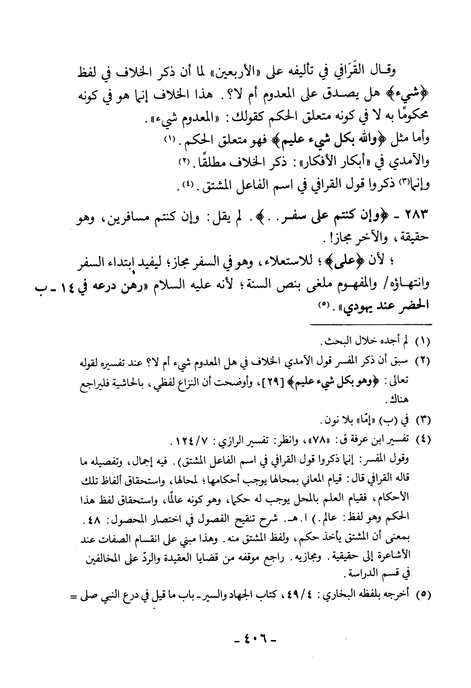 وقال القَرَافي في تأليفه على " الأربعين " لما أن ذكر الخلاف في لفظ (شيء) هل يصدق على المعدوم أم لا؟. هذا الخلاف إنما هو في كونه محكومًا به لا في كونه متعلق الحكم كقولك: " المعدوم شيء ".
