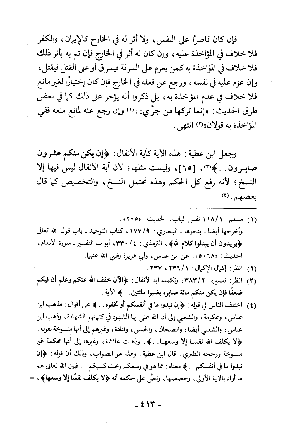 وجعل ابن عطية: هذه الآية كآية الأنفال: (إن يكن منكم عشرون صابرون. .)، وليست مثلها؛ لأن آية الأنفال ليس فيها إلا النسخ؛ لأنه رفع كل الحكم وهذه تحتمل النسخ، والتخصيص كما قال بعضهم.