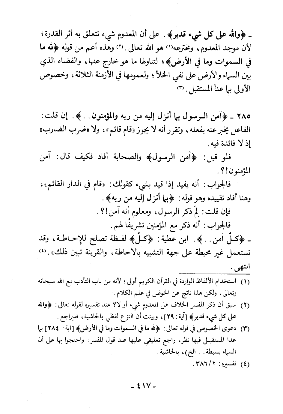 - (واللَّه على كل شيء قدير). على أن المعدوم شيء تتعلق به أثر القدرة؛ لأن موجد المعدوم، ومخترعه هو اللَّه تعالى. وهذه أعم من قوله (للَّه ما في السماوات وما في الأرض)، لتناولها ما هو خارج عنها، والفضاء الذي بين السماء والأرض على نفي الخلأ؛ ولعمومها في الأزمنة الثلاثة، وخصوص الأولى بما عدا المستقبل.