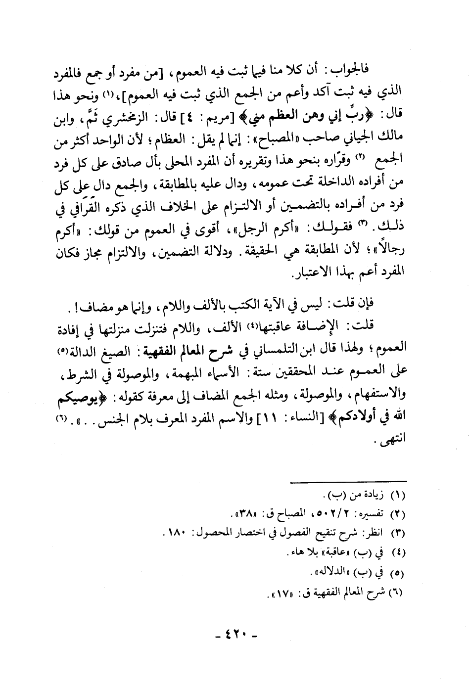 قلت: الإِضافة عاقبتها الألف، واللام فتنزلت منزلتها في إفادة العموم؛ ولهذا قال ابن التلمساني في شرح المعالم الفقهية: الصيغ الدالة على العموم عند المحققين ستة: الأسماء المبهمة، والموصولة في الشرط، والاستفهام، والموصولة، ومثله الجمع المضاف إلى معرفة كقوله: (يوصيكم اللَّه في أولادكم)، والاسم المفرد المعرف بلام الجنس. . ". انتهى.