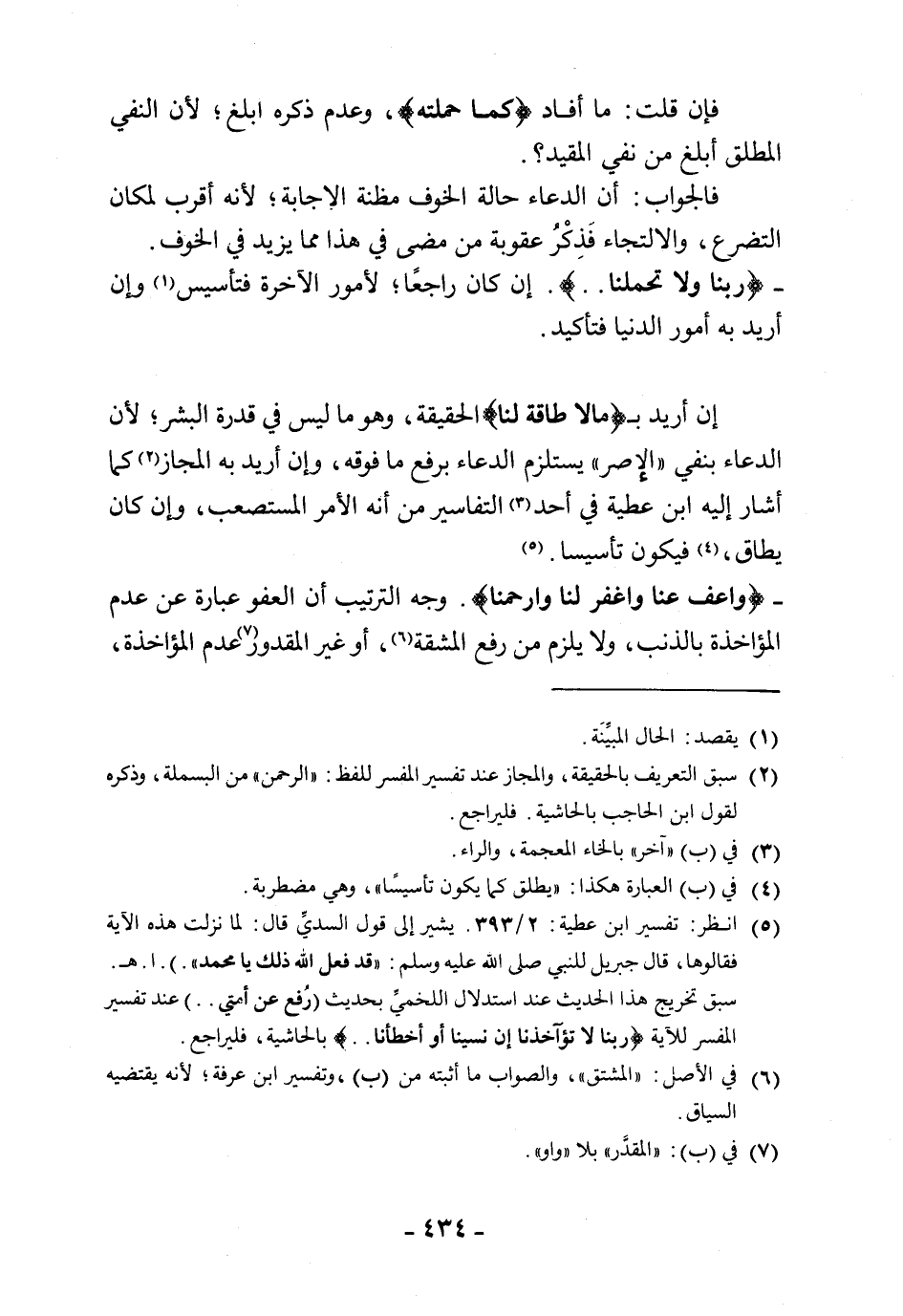 إن أريد بـ (مالا طاقة لنا) الحقيقة، وهو ما ليس في قدرة البشر؛ لأن الدعاء بنفي " الإصر " يستلزم الدعاء برفع ما فوقه، وإن أريد به المجاز كما أشار إليه ابن عطية في أحد التفاسير من أنه الأمر المستصعب، وإن كان يطاق، فيكون تأسيسا.