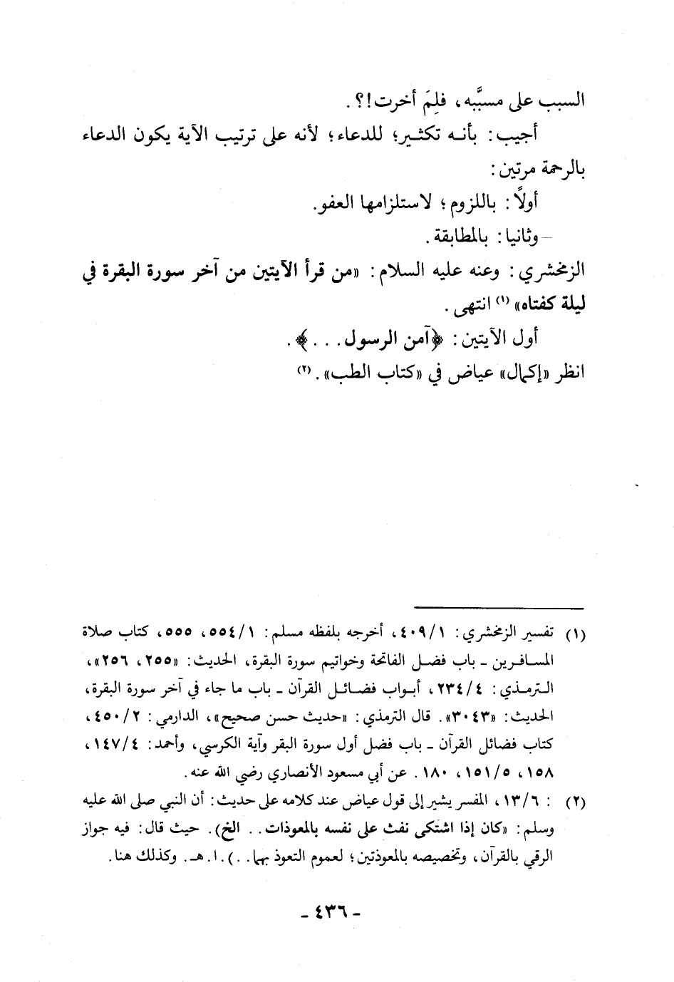 الزمخشري: وعنه عليه السلام: " من قرأ الآيتين من آخر سورة البقرة في ليلة كفتاه " انتهى.