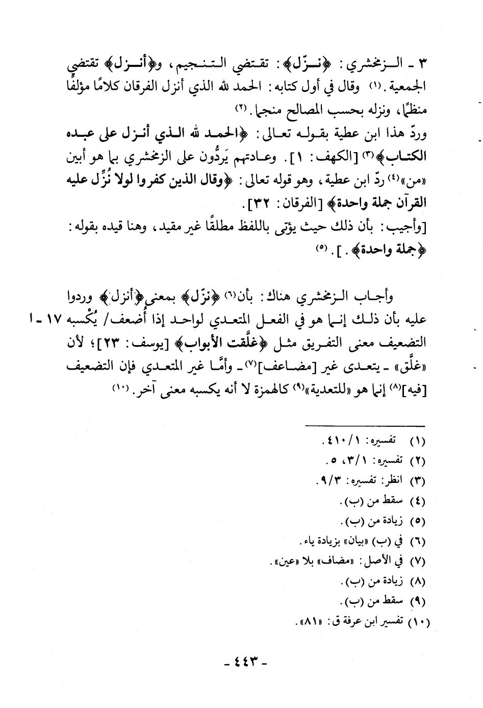 (3) - الزمخشري: (نزَّل): تقتضي التنجيم، و (وأنزل) تقتضى الجمعية. وقال في أول كتابه: الحمد لله الذي أنزل الفرقان كلامًا مؤلفٌا منظمًا، ونزله بحسب المصالح منجما.