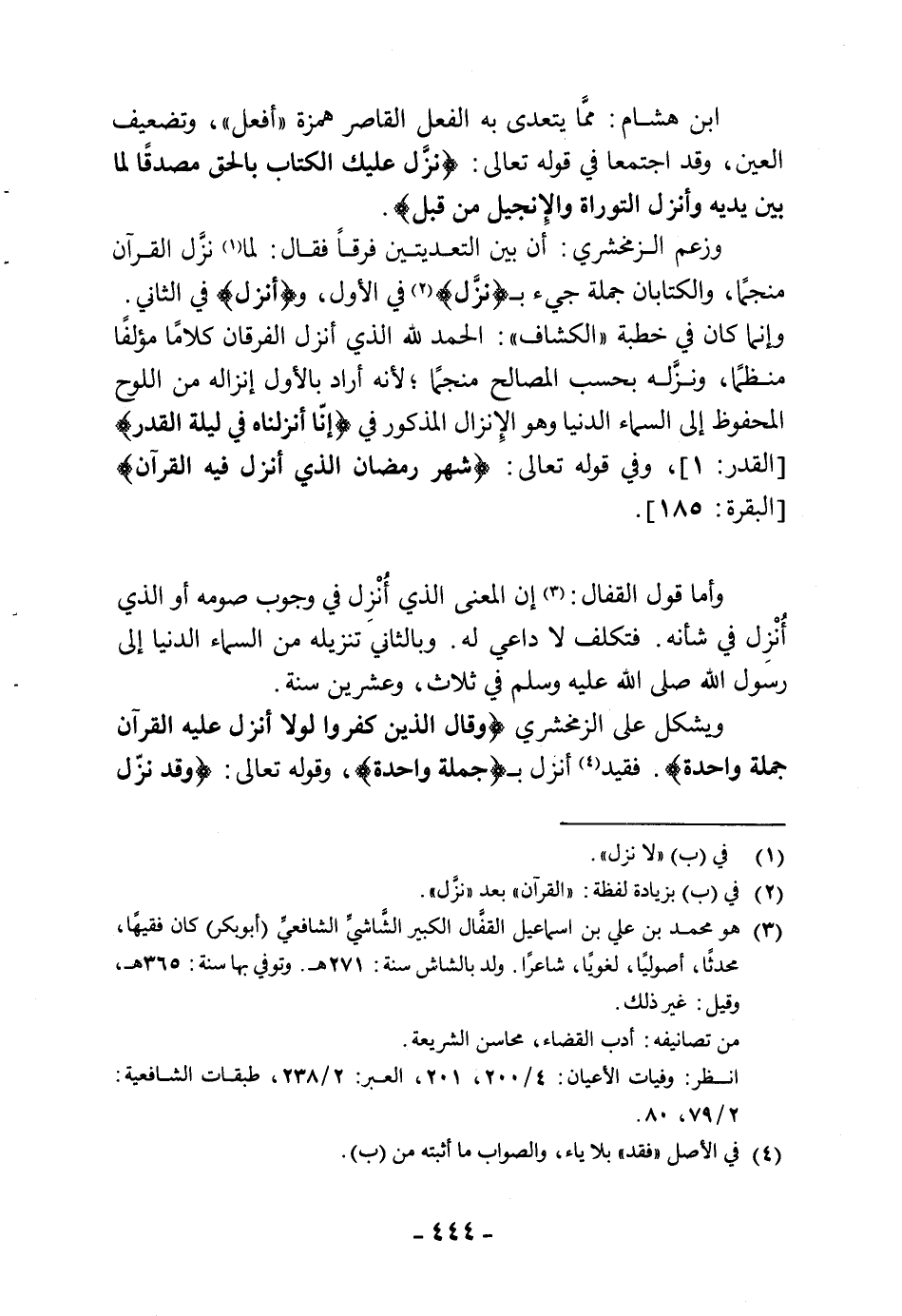 ابن هشام: ممَّا يتعدى به الفعل القاصر همزة " أفعل "، وتضعيف العين، وقد اجتمعا في قوله تعالى: (نَزَّلَ عَلَيْكَ الْكِتَابَ بِالْحَقِّ مُصَدِّقًا لِمَا بَيْنَ يَدَيْهِ وَأَنْزَلَ التَّوْرَاةَ وَالْإِنْجِيلَ (3) مِنْ قَبْلُ).