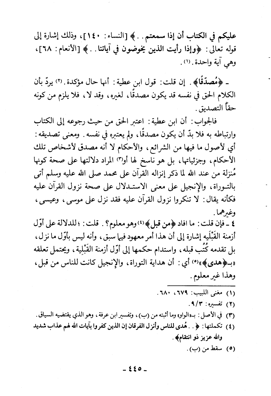 4 - فإن قلت: ما افاد (من قبل) وهو معلوم؟. قلت: للدلالة على أوّل أزمنة القَبْلَية إشارة إلى أن هذا أمر معهود فيما سبق، وأنه ليس بأوّل ما نزل، بل تقدمه كُتُب قبله، واستدام حكمها إلى أوّل أزمنة القَبْلِية، ويحتمل تعلقه بـ (هدى) أي: أن هداية التوراة، والإِنجيل كانت للناس من قبل، وهذا غير معلوم.