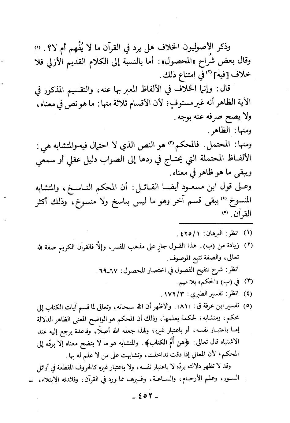 ومنها: المحتمل. فالمحكم هو النص الذي لا احتمال فيه والمتشابه هي: الألفاظ المحتملة التي يحتاج في ردها إلى الصواب دليل عقلي أو سمعي ويبقى ما هو ظاهر في معناه.