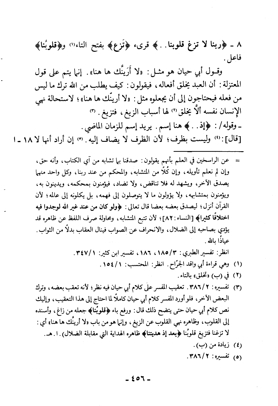 وقول أبي حيان هو مثل: " لا أَرَينَّك ها هنا ". إنما يتم على قول المعتزلة: أن العبد يخلق أفعاله، فيقولون: كيف يطلب من الله ترك ما ليس من فعله فيحتاجون إلى أن يجعلوه مثل: " لا أرينّك ها هنا "؛ لاستحالة نهي الإِنسان نفسه ألَّا يخلق لها أسباب الزيغ، فتزيغ.