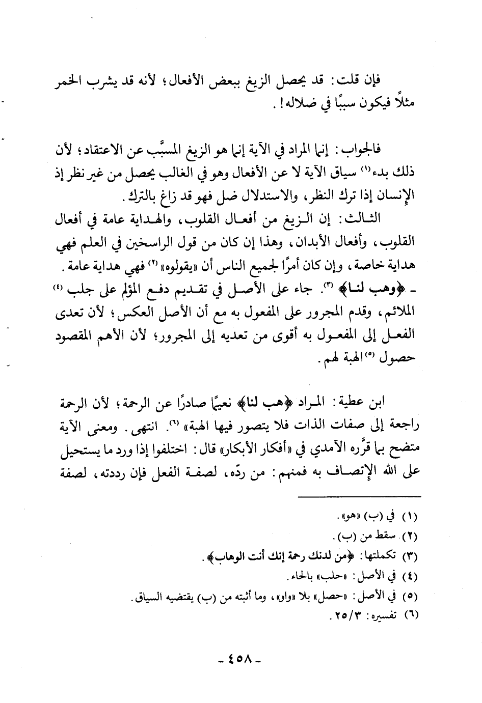 ابن عطية: المراد (هب لنا) نعيمًا صادرًا عن الرحمة، لأن الرحمة راجعة إلى صفات الذات فلا يتصور فيها الهبة ". انتهى. ومعنى الآية متضح بما قرَّره الآمدي في " أفكار الأبكار " قال: اختلفوا إذا ورد ما يستحيل على اللَّه الإِتصاف به فمنهم: من رده، لصفة الفعل فإن رددته، لصفة