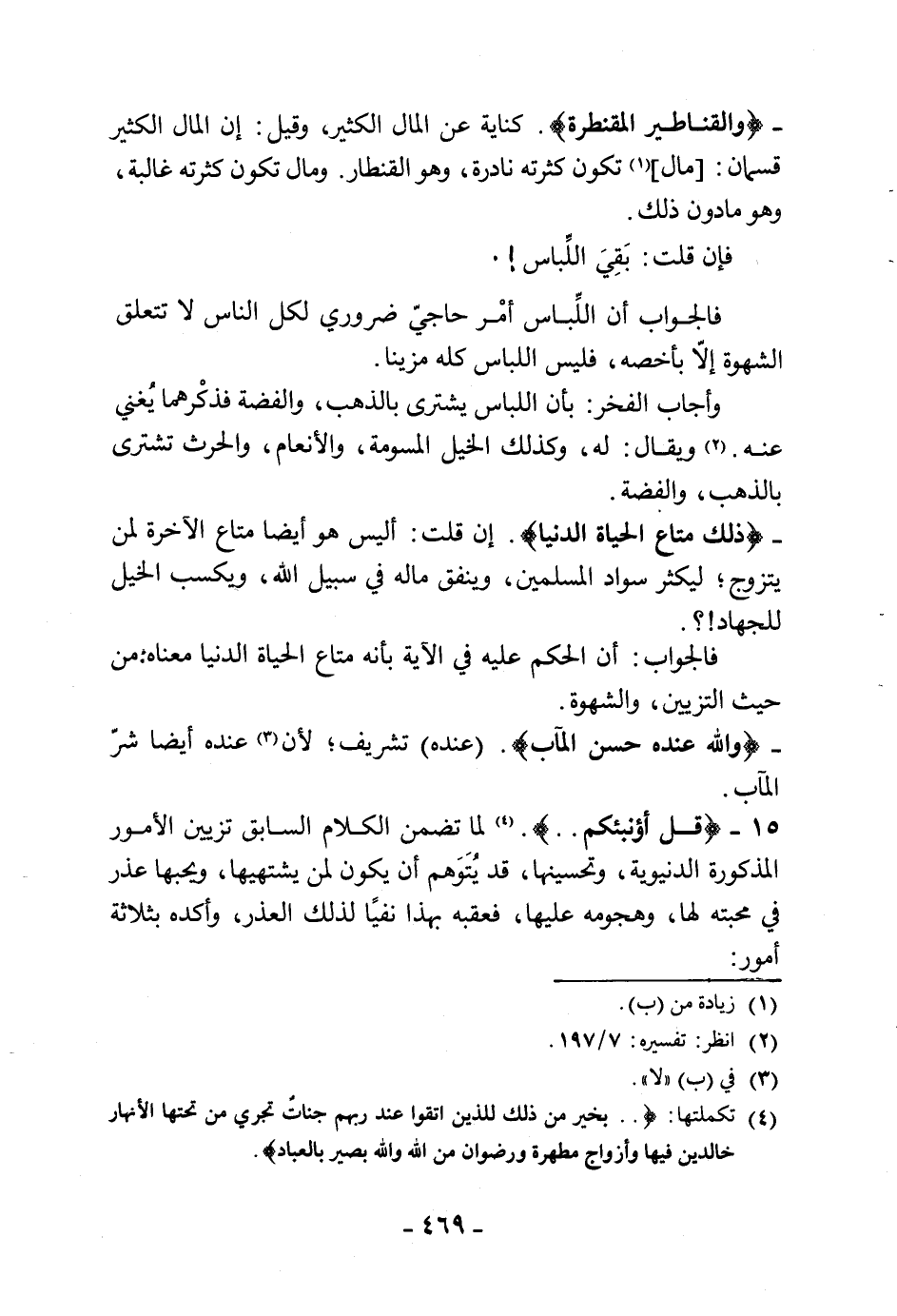 15 - (قل أؤنبئكم. . .) لما تضمن الكلام السابق تزيين الأمور المذكورة الدنيوية، وتحسينها، قد يُتَوَهم أن يكون لمن يشتهيها، ويحبها عذر في محبته لها، وهجومه عليها، فعقبه بهذا نفيًا لذلك العذر، وأكده بثلاثة أمور:
